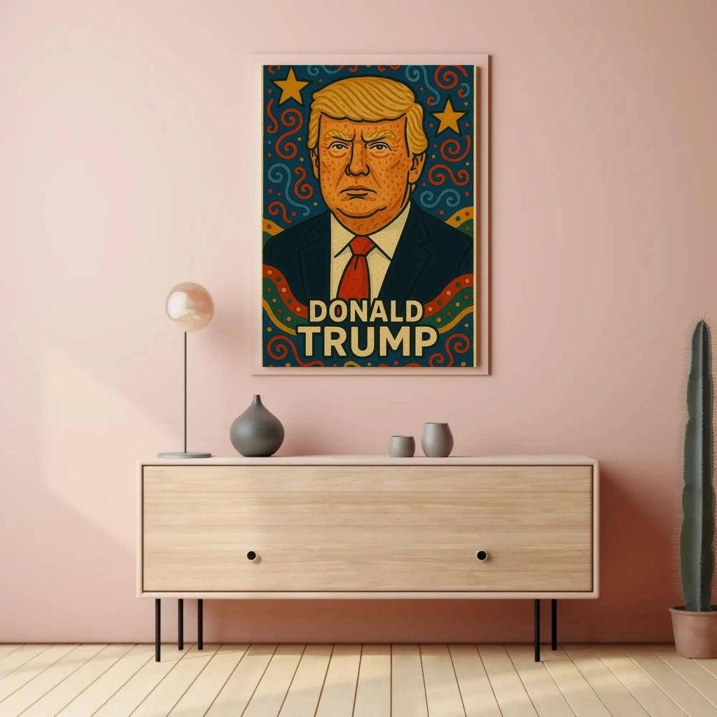 Bring bold, nostalgic energy to your walls with this striking pop culture art poster from PosterGoat. The retro-inspired illustration centers on a powerful, iconic public figure rendered in vibrant, contrasting colors and thick graphic lines—set against a swirling backdrop of stars and dynamic patterns that demand attention.