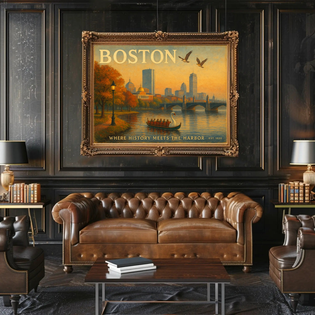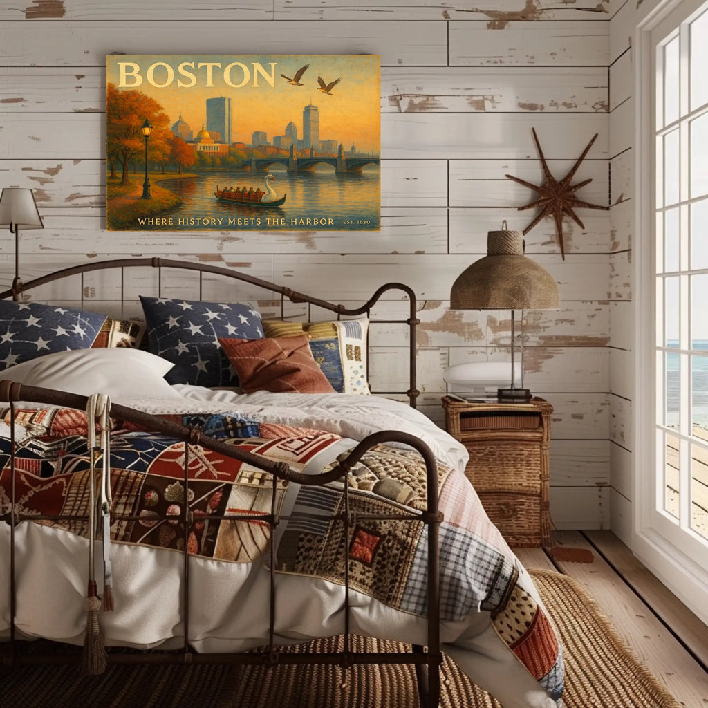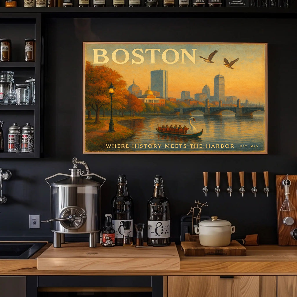 This museum-quality poster features a serene river scene framed by autumn trees and a classic lamp post, a graceful swan boat gliding across calm water, and Boston’s iconic skyline and arched bridge glowing in soft, golden light. Two birds soar above the city while the elegant tagline "Where History Meets the Harbor" reinforces the poster’s travel-inspired charm.