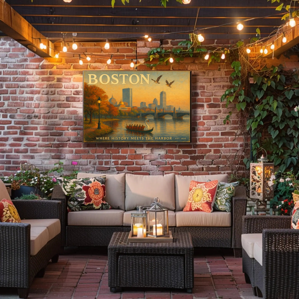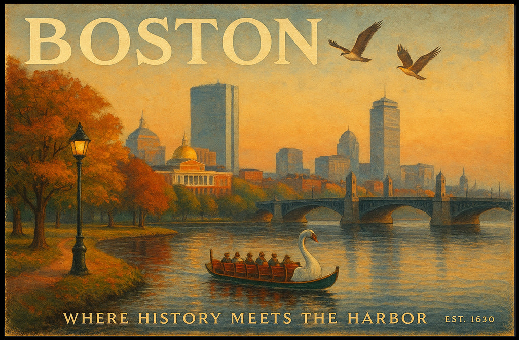 Bring Boston's timeless beauty into your home with the Boston Scenic Charm Travel Poster from PosterGoat — a vintage-inspired art print that blends historic landmarks with warm, nostalgic color for an instant focal point in any room.