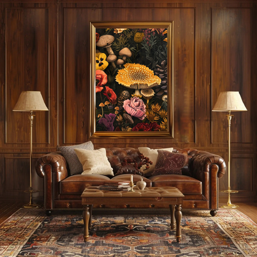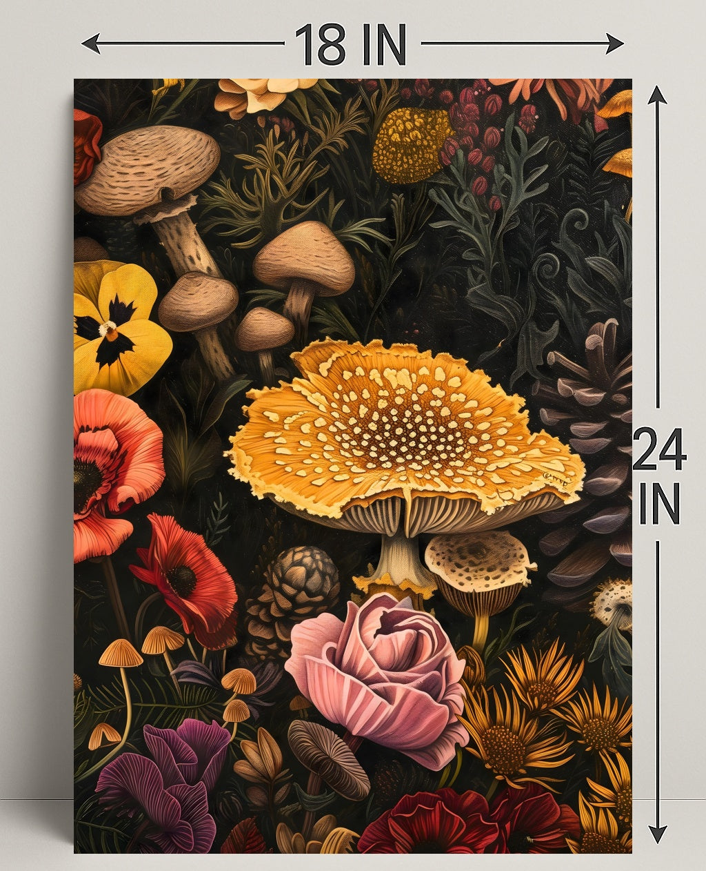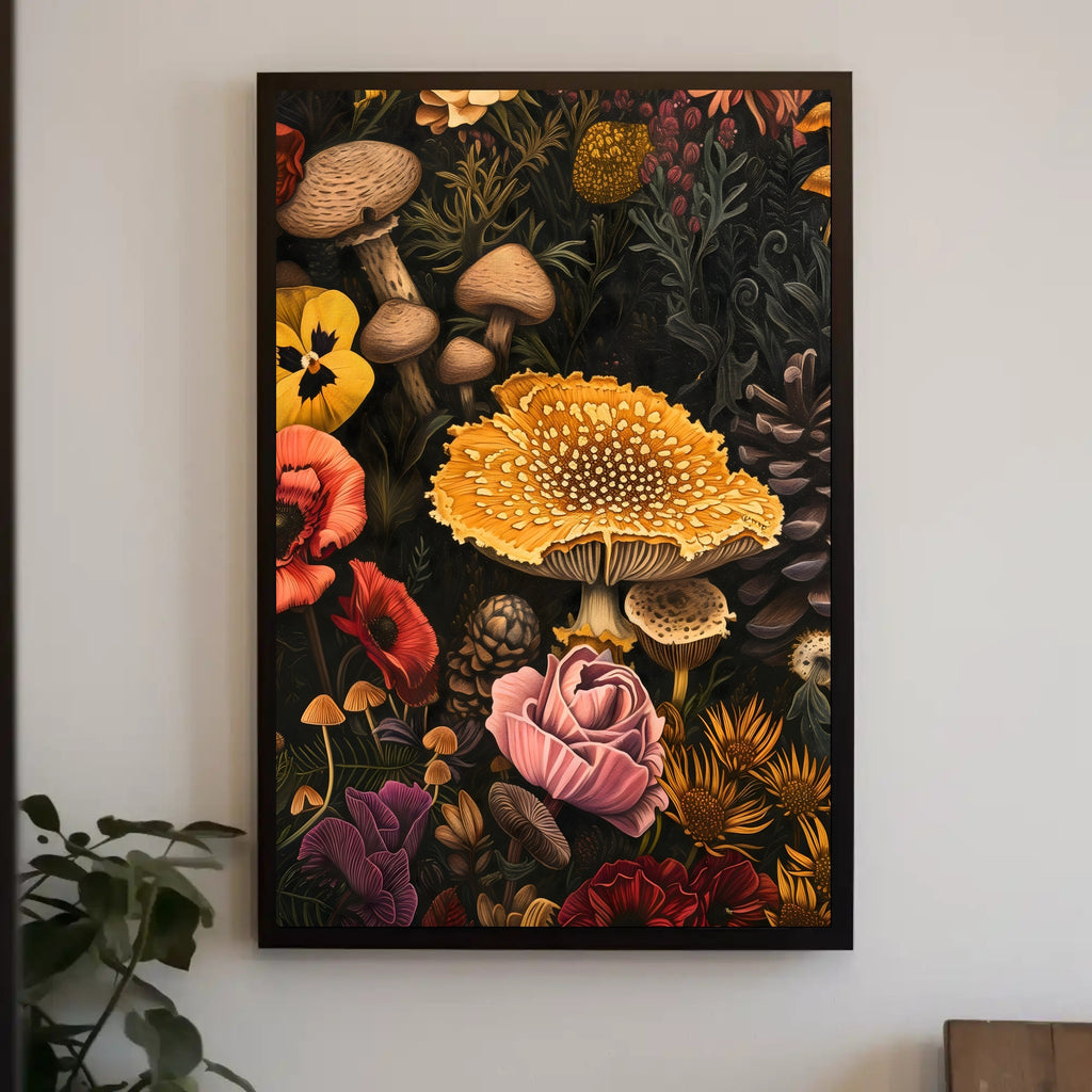 Botanical Mushroom Illustration Educational or Infographic Poster by PosterGoat brings the wonder of woodland flora into your home with museum-quality illustration and vintage scientific charm. Rich, layered artwork showcases a central golden mushroom surrounded by roses, poppies, pine cones and delicate fungi — every petal, gill and frond rendered in crisp, realistic detail for an immersive botanical study.