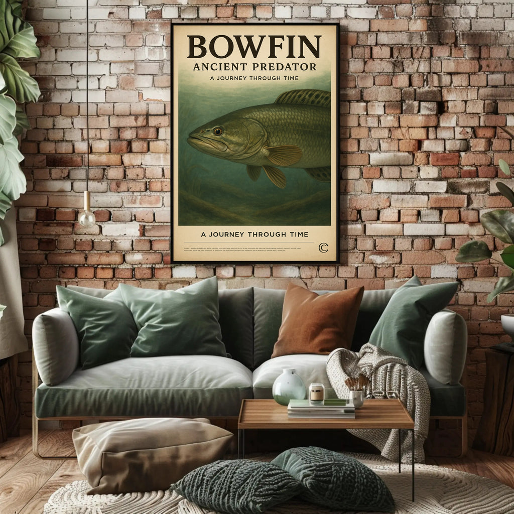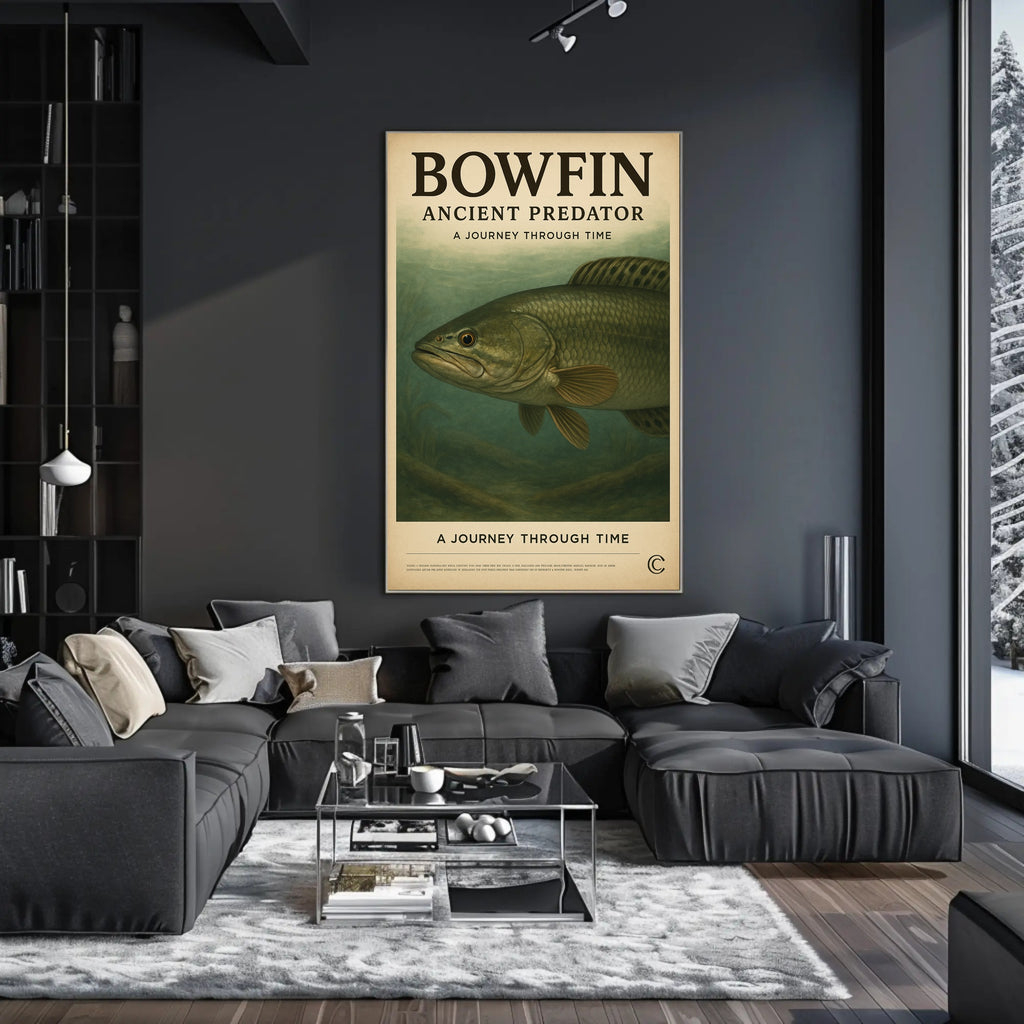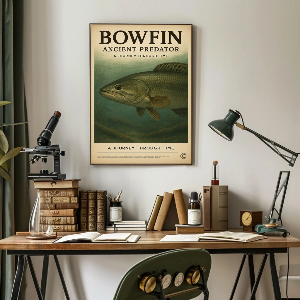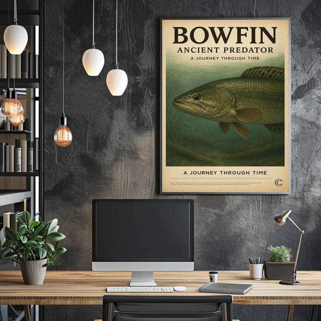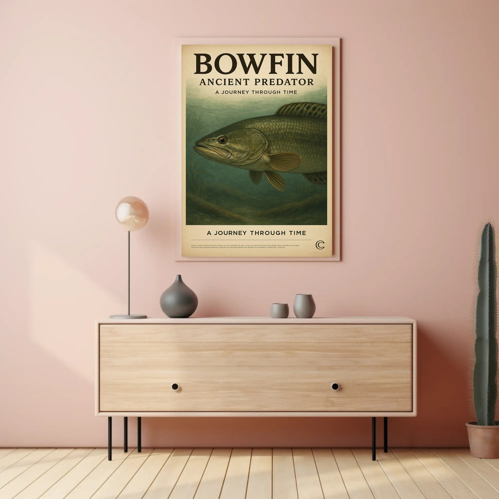 Bowfin Ancient Predator Poster — a striking, museum-style art print from PosterGoat that brings the ancient elegance of the bowfin to your walls. This poster pairs vintage typography with a finely detailed underwater illustration, creating a timeless piece that fits perfectly in modern and minimalist interiors.