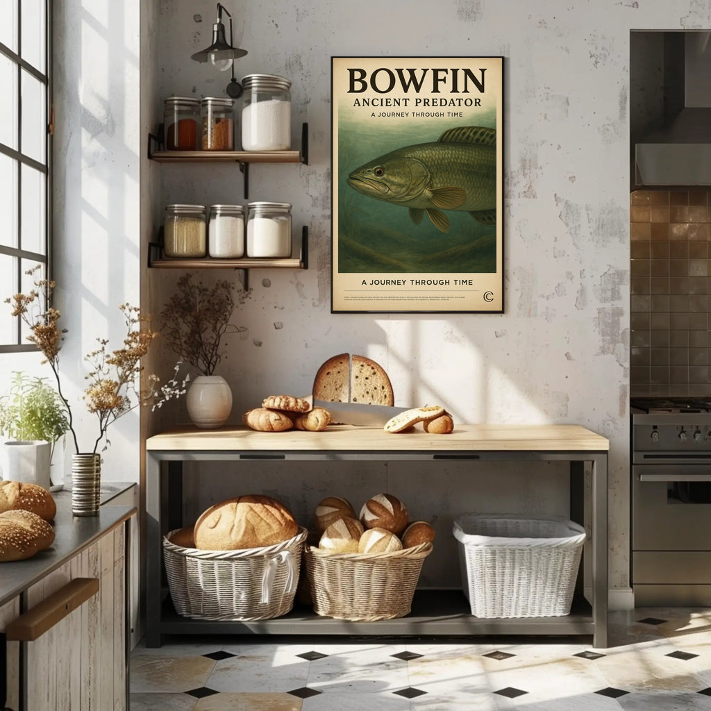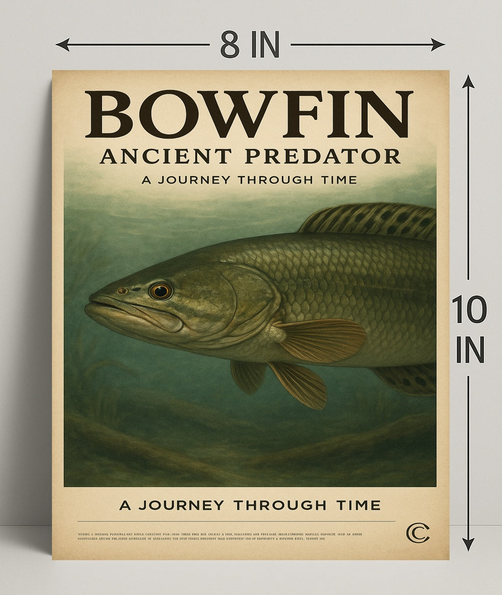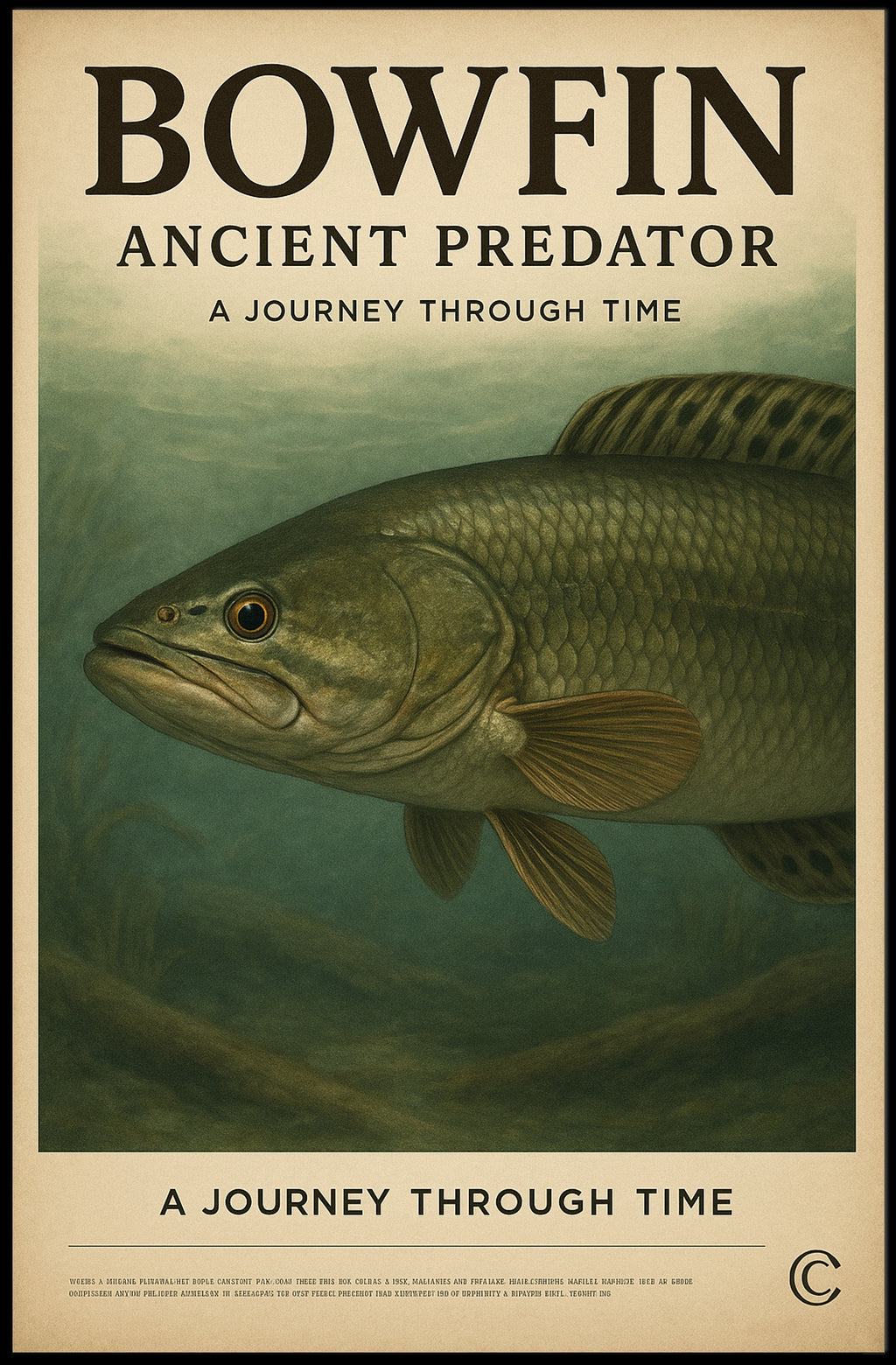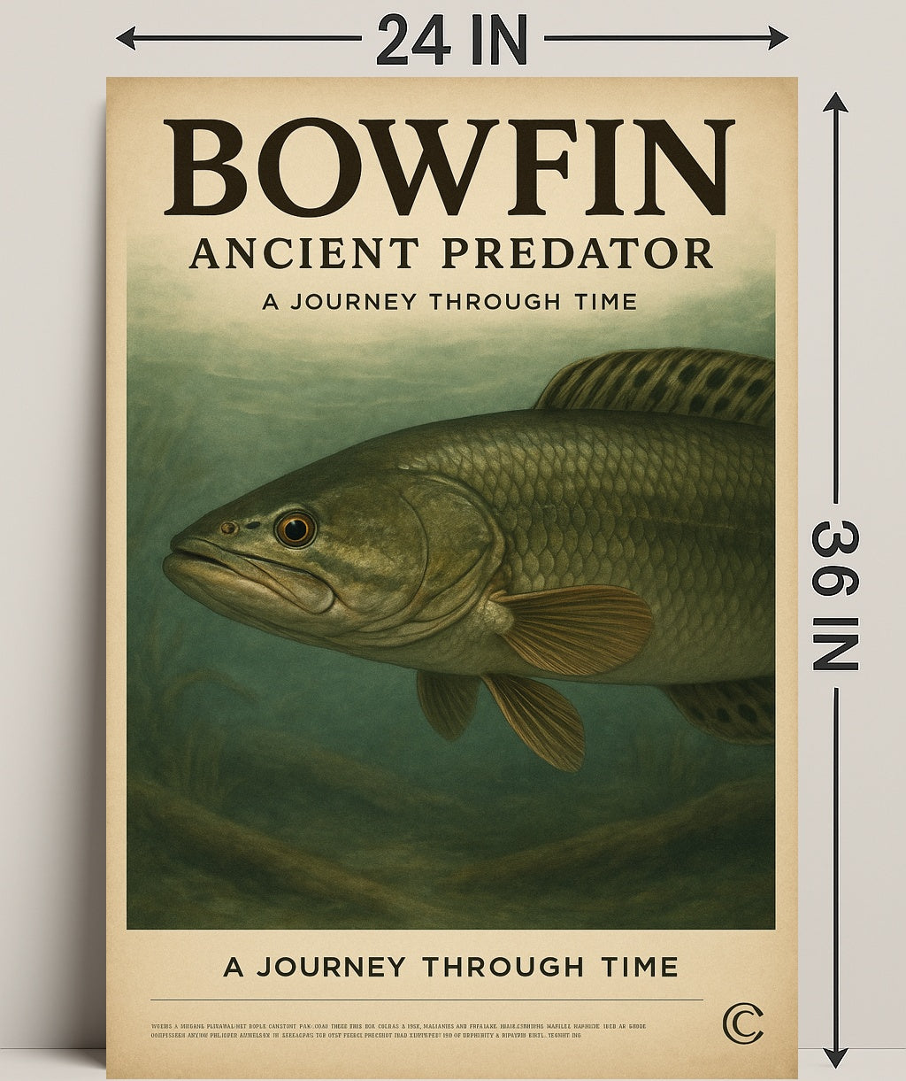 Bowfin Ancient Predator Poster — a striking, museum-style art print from PosterGoat that brings the ancient elegance of the bowfin to your walls. This poster pairs vintage typography with a finely detailed underwater illustration, creating a timeless piece that fits perfectly in modern and minimalist interiors.