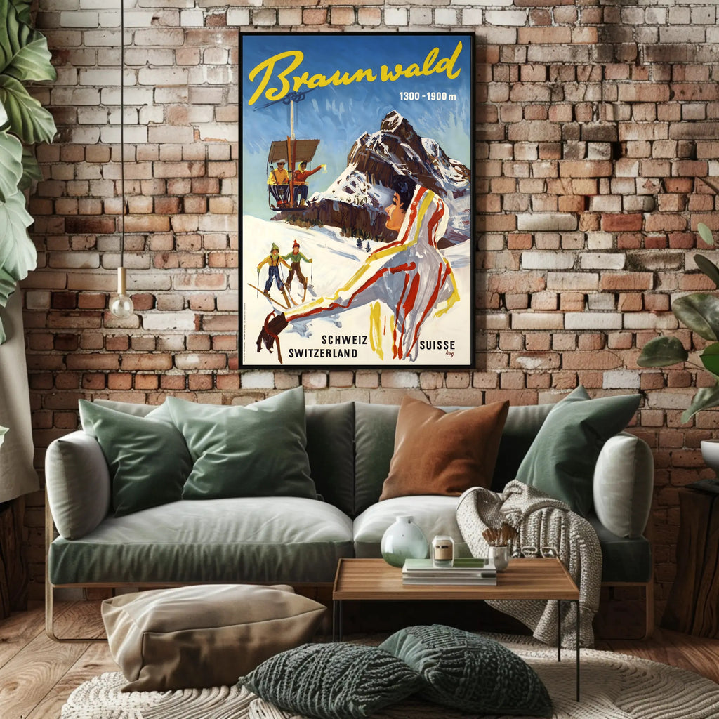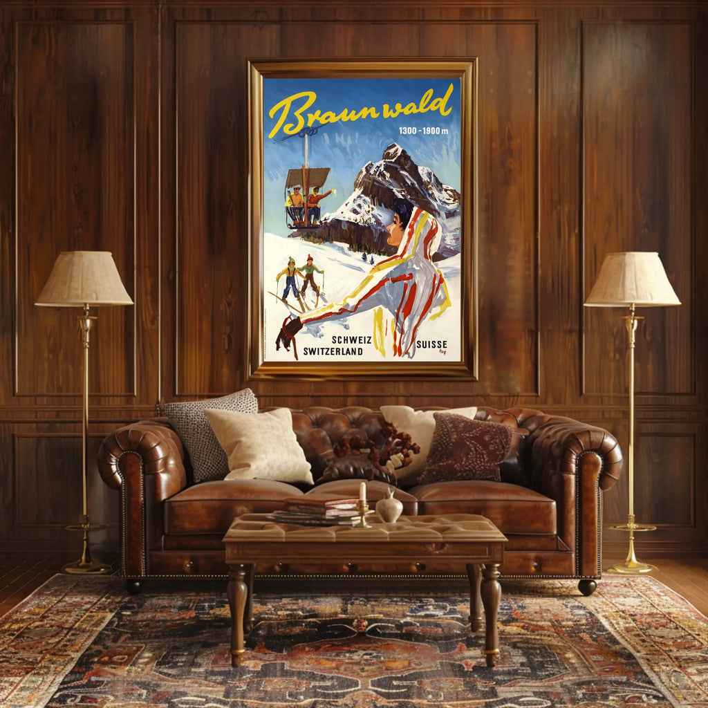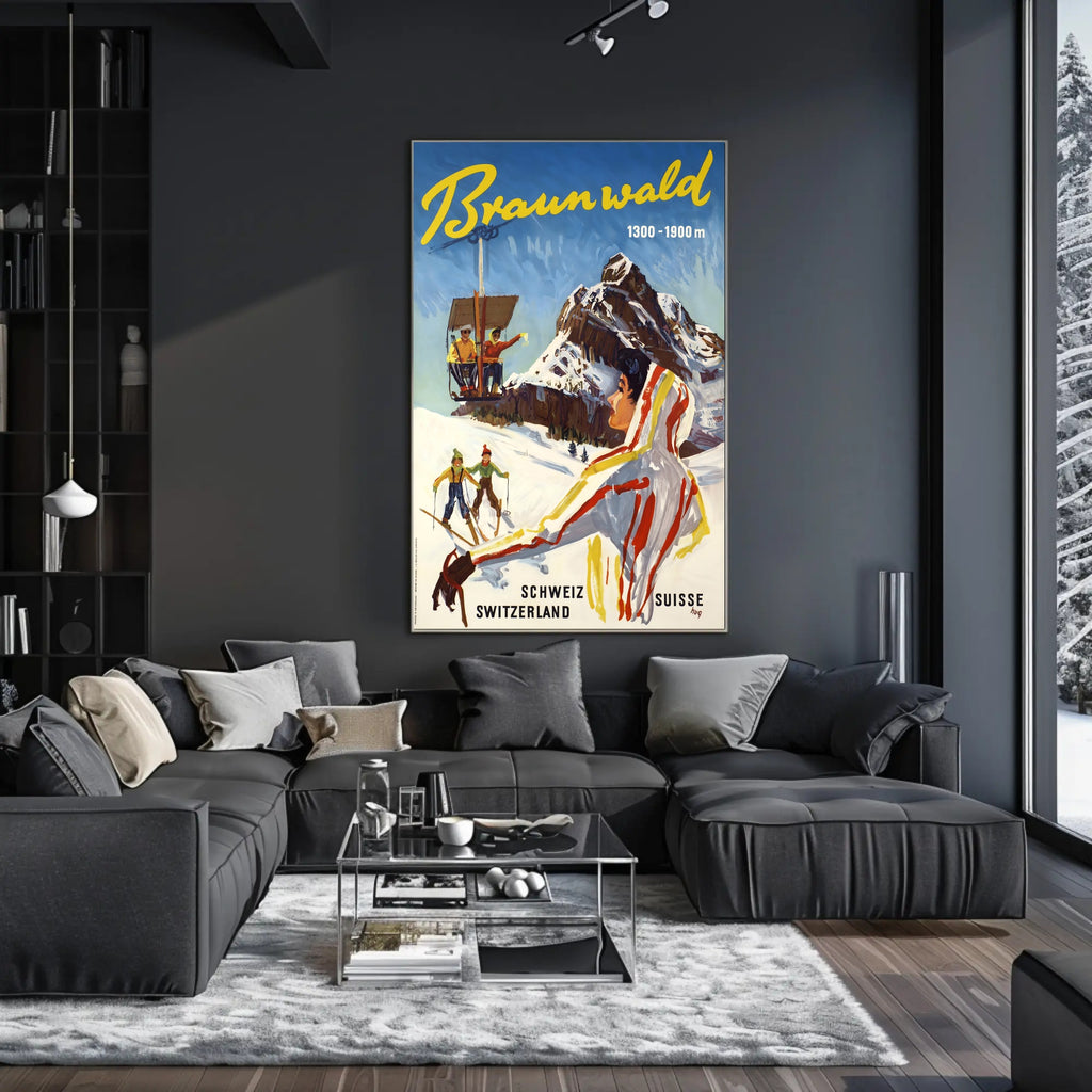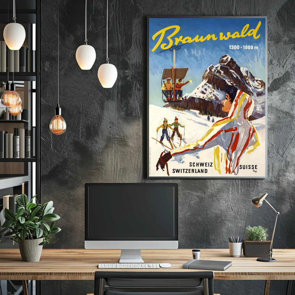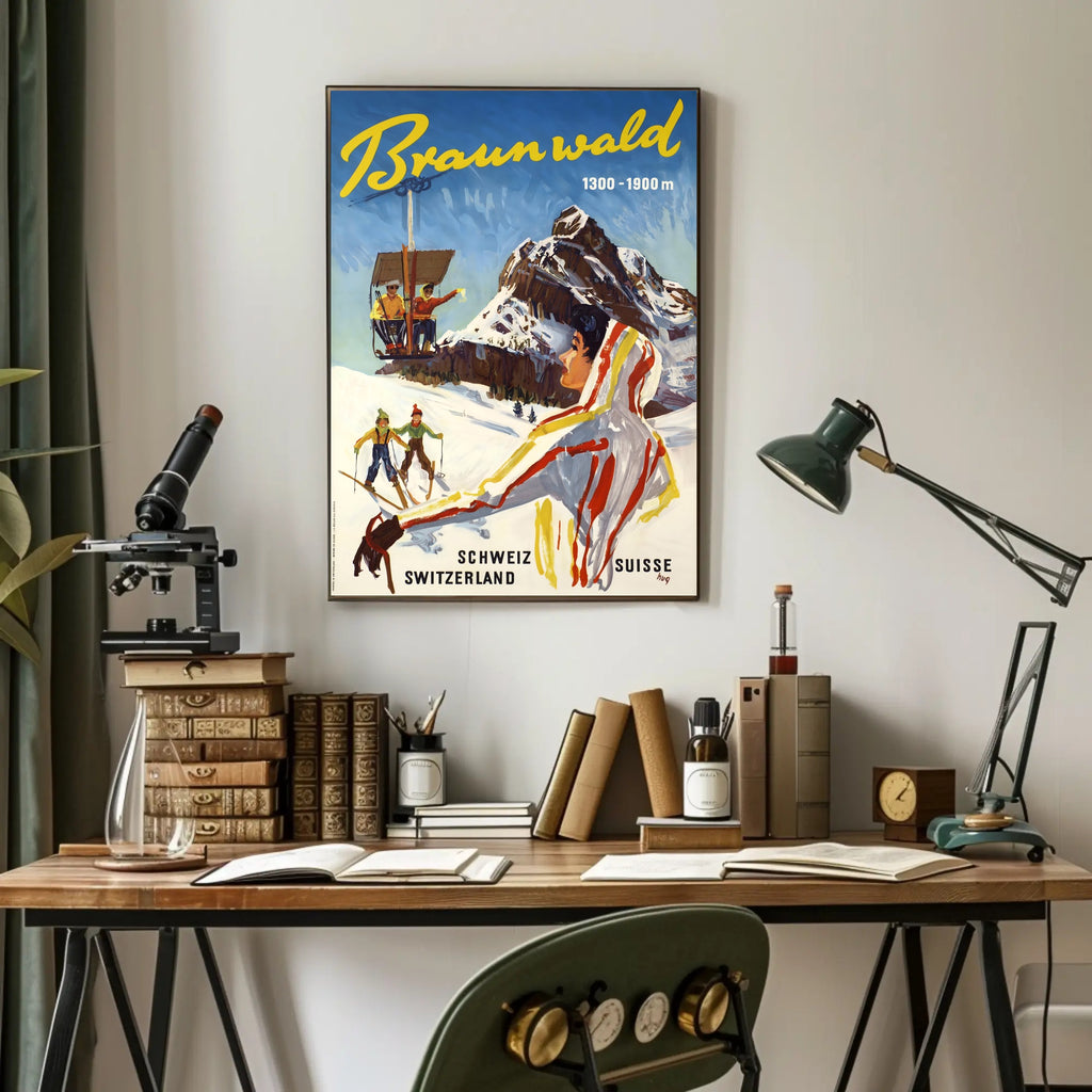 Bring the thrill of the Swiss Alps into your home with the Braunwald Winter Sports Poster from PosterGoat — a vintage-style art print that captures crisp mountain air, sunlit slopes and après-ski nostalgia in bold painterly strokes.