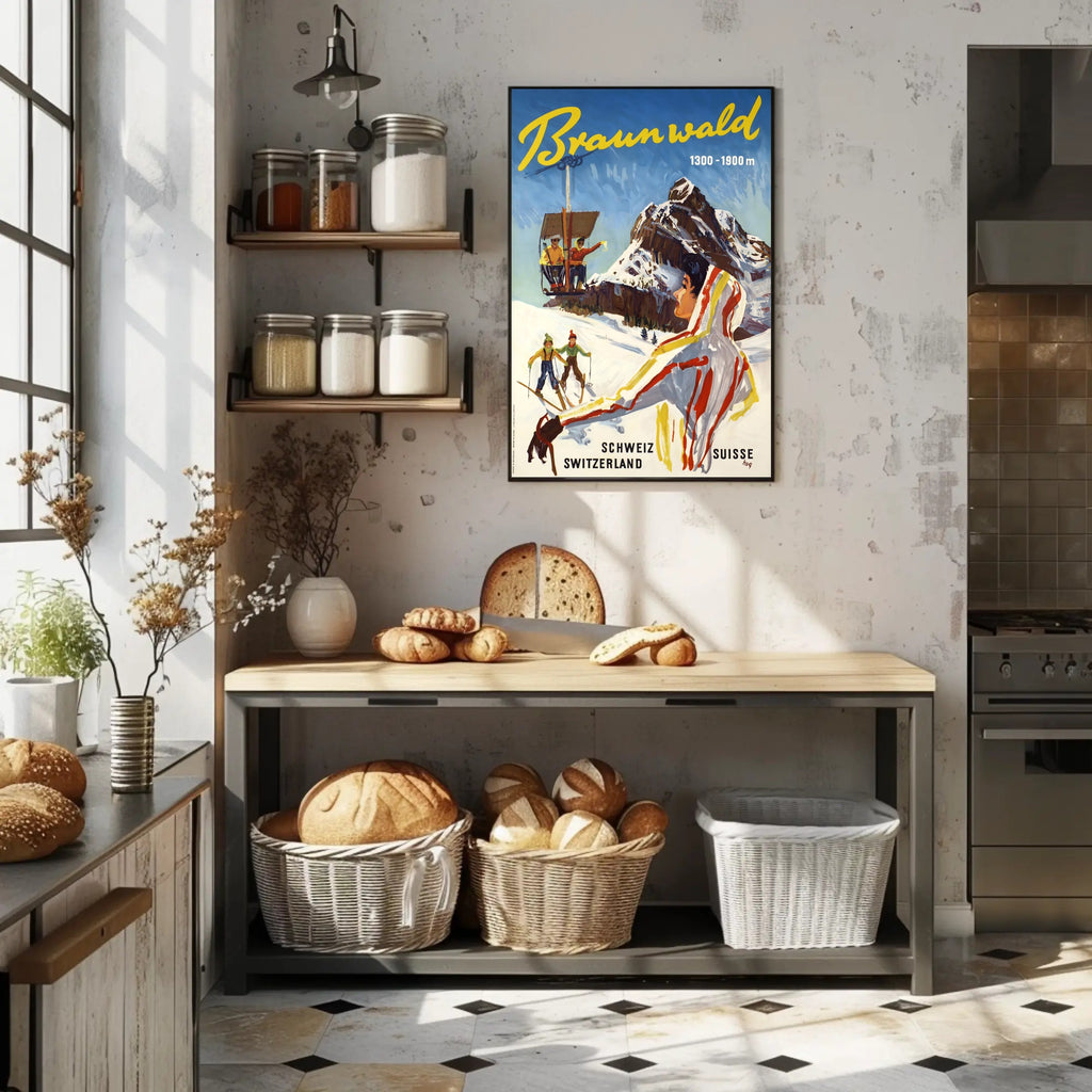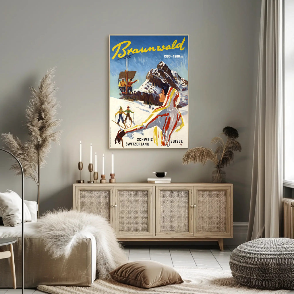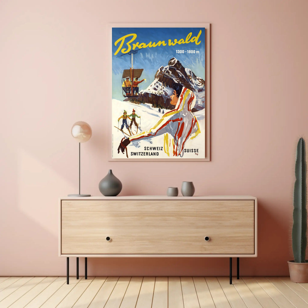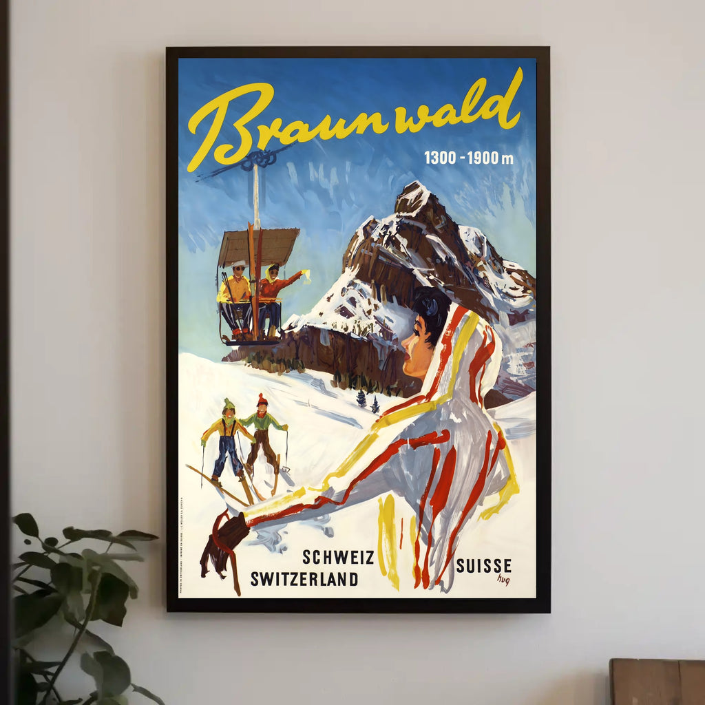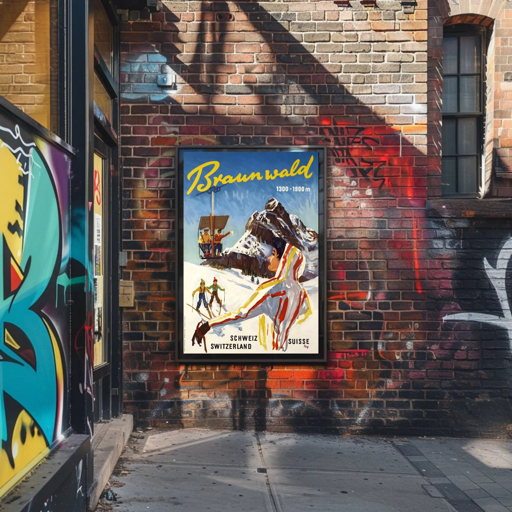 Bring the thrill of the Swiss Alps into your home with the Braunwald Winter Sports Poster from PosterGoat — a vintage-style art print that captures crisp mountain air, sunlit slopes and après-ski nostalgia in bold painterly strokes.