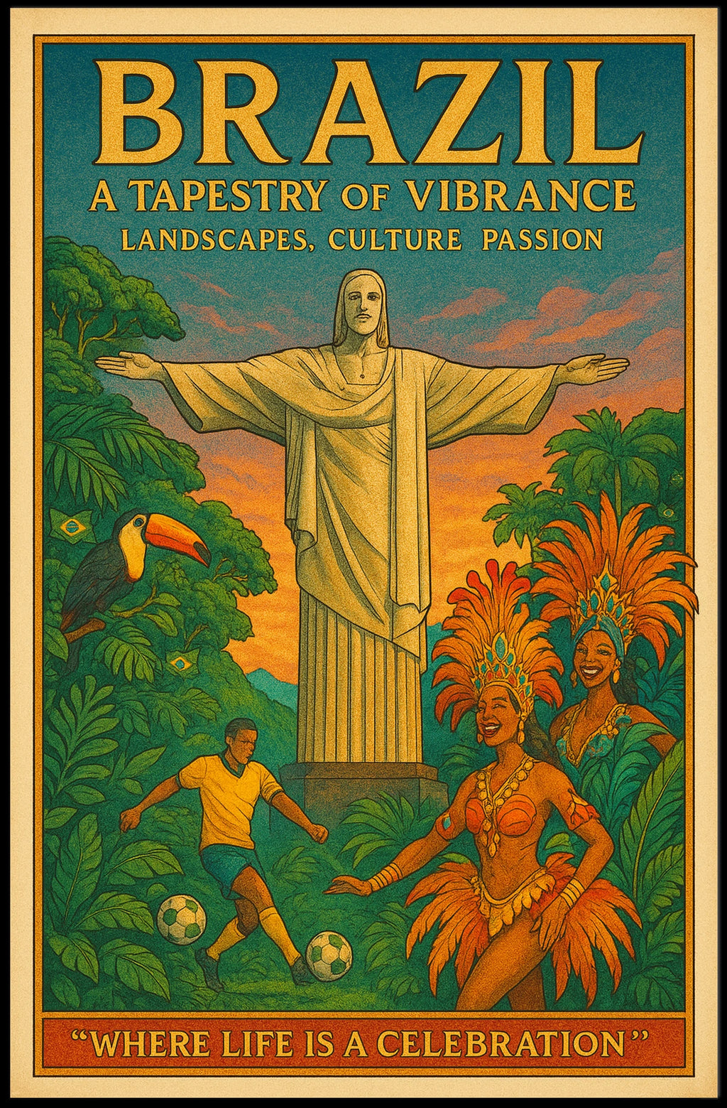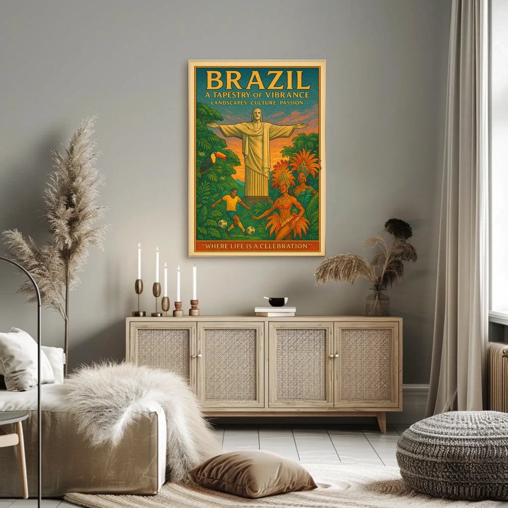 Explore the spirit of Brazil with the Brazil A Tapestry of Vibrance Poster. This decor-forward art print captures lively scenery and bold color to charm any room. Designed for decor lovers and wanderlust spirits, it brings real-world landscapes into your space, turning blank walls into a vibrant journey. Ideal for living rooms, bedrooms, or workspaces, it adds warmth, character, and tropical energy.