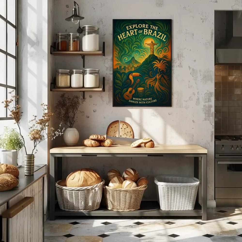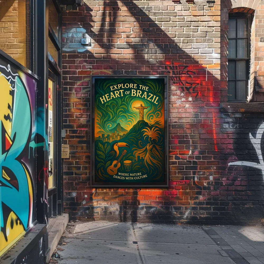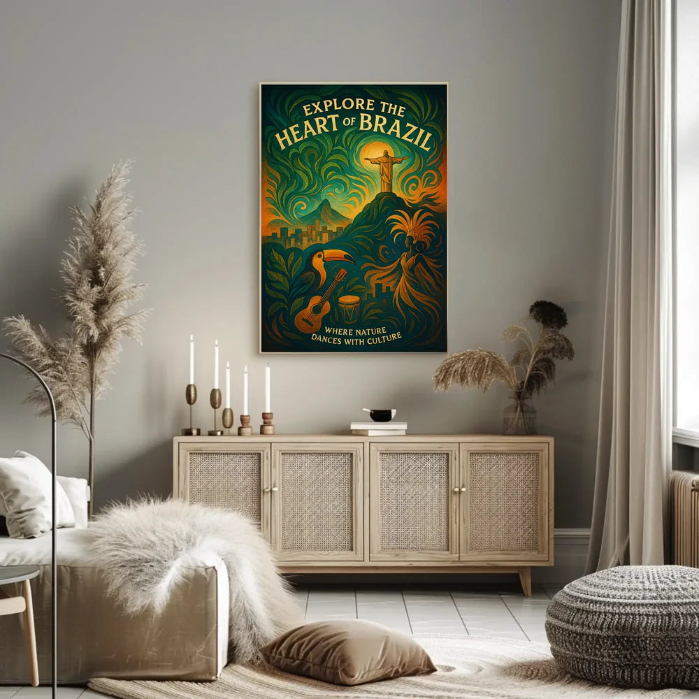 Experience the vibrant spirit of Brazil with this captivating poster, blending the country's natural wonders and cultural richness. The dynamic composition features the iconic Christ the Redeemer statue, alongside a toucan, guitar, and drum, encapsulating the essence of Brazil's lively atmosphere. A detailed city skyline with swirling patterns suggests a festive ambience, inviting viewers to embark on a journey full of exploration and excitement. The vibrant, illustrative style uses rich earthy colors and dynamic lines to evoke energy and spontaneity, making it an ideal piece for those with an adventurous spirit or a love for Brazilian culture.