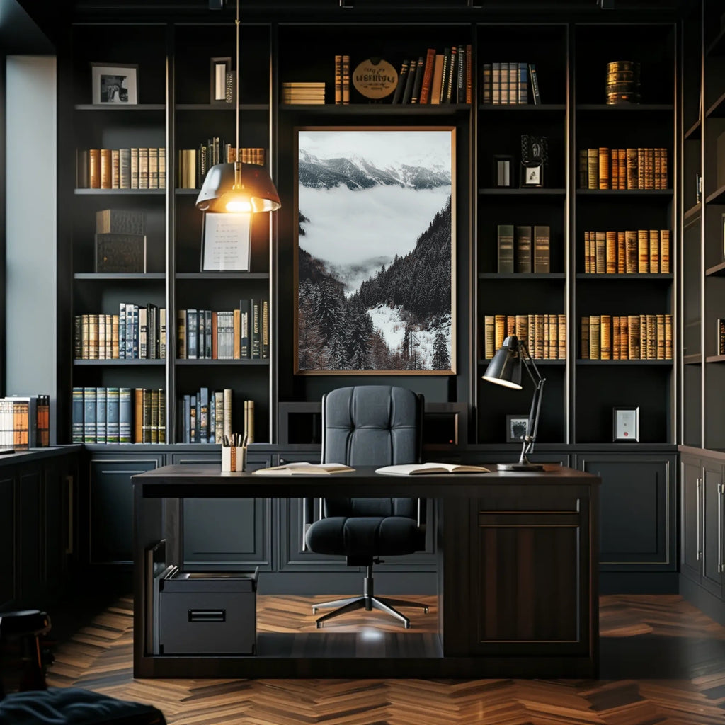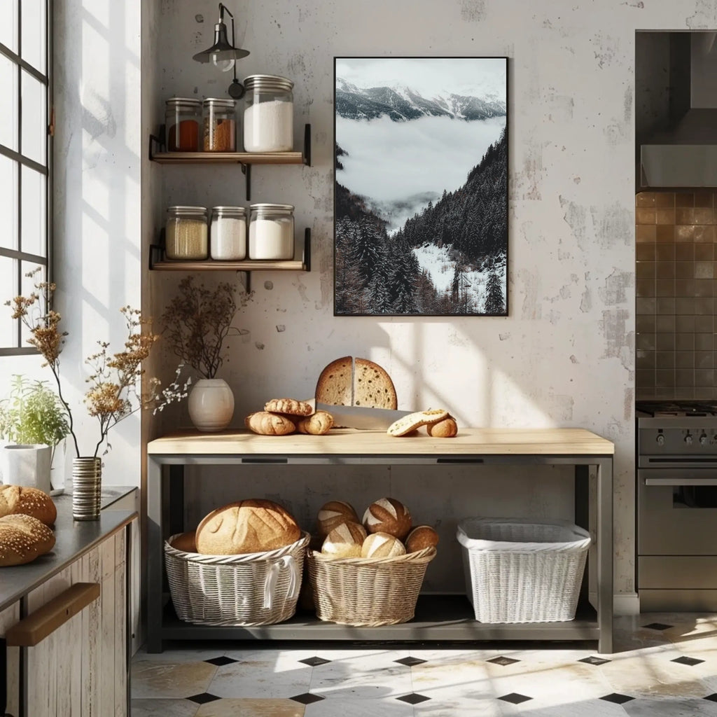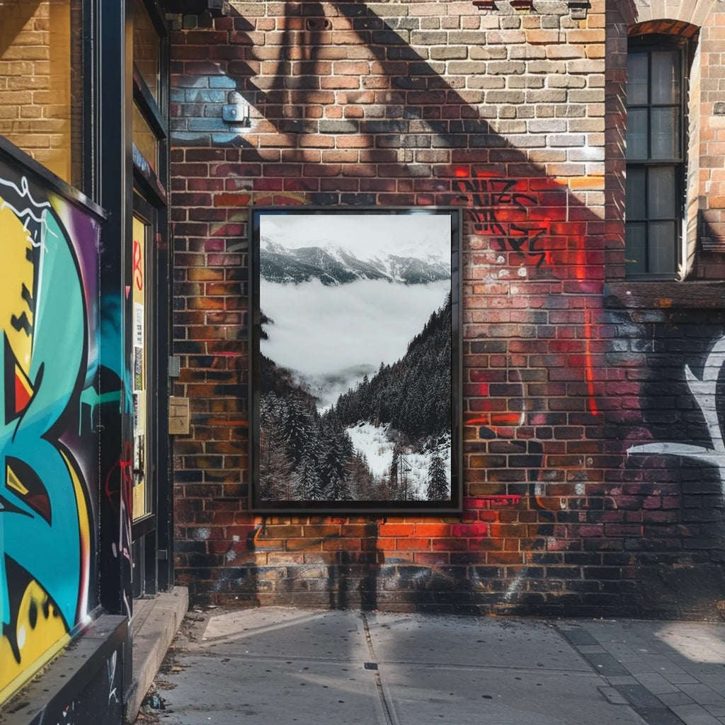 This artwork renders a dense coniferous forest blanketed in pristine snow, set in an alpine region reminiscent of the European Alps. A striking contrast unfolds between the dark green trees and the bright, white landscape, while a subtle mist hovers above the scene to impart a sense of mystery and tranquility. Snow-covered mountain peaks rise in the background, heightening the drama and grandeur of untouched wilderness. Ideal for those who appreciate the peaceful solitude and majesty of nature, this poster invites a timeless appreciation for the awe-inspiring beauty of winter landscapes.