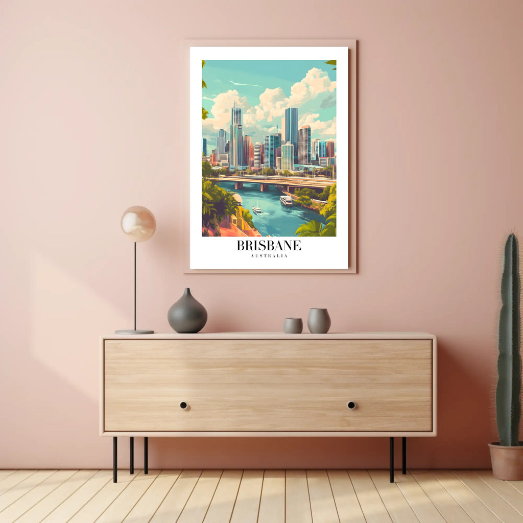 Perfect for: lovers of Australian art, fans of city skyline art, and anyone seeking modern wall art to enhance a gallery wall or workspace. This Brisbane poster fits the Posters, Prints & Visual Artwork category and complements mid-century modern and minimalist interiors.