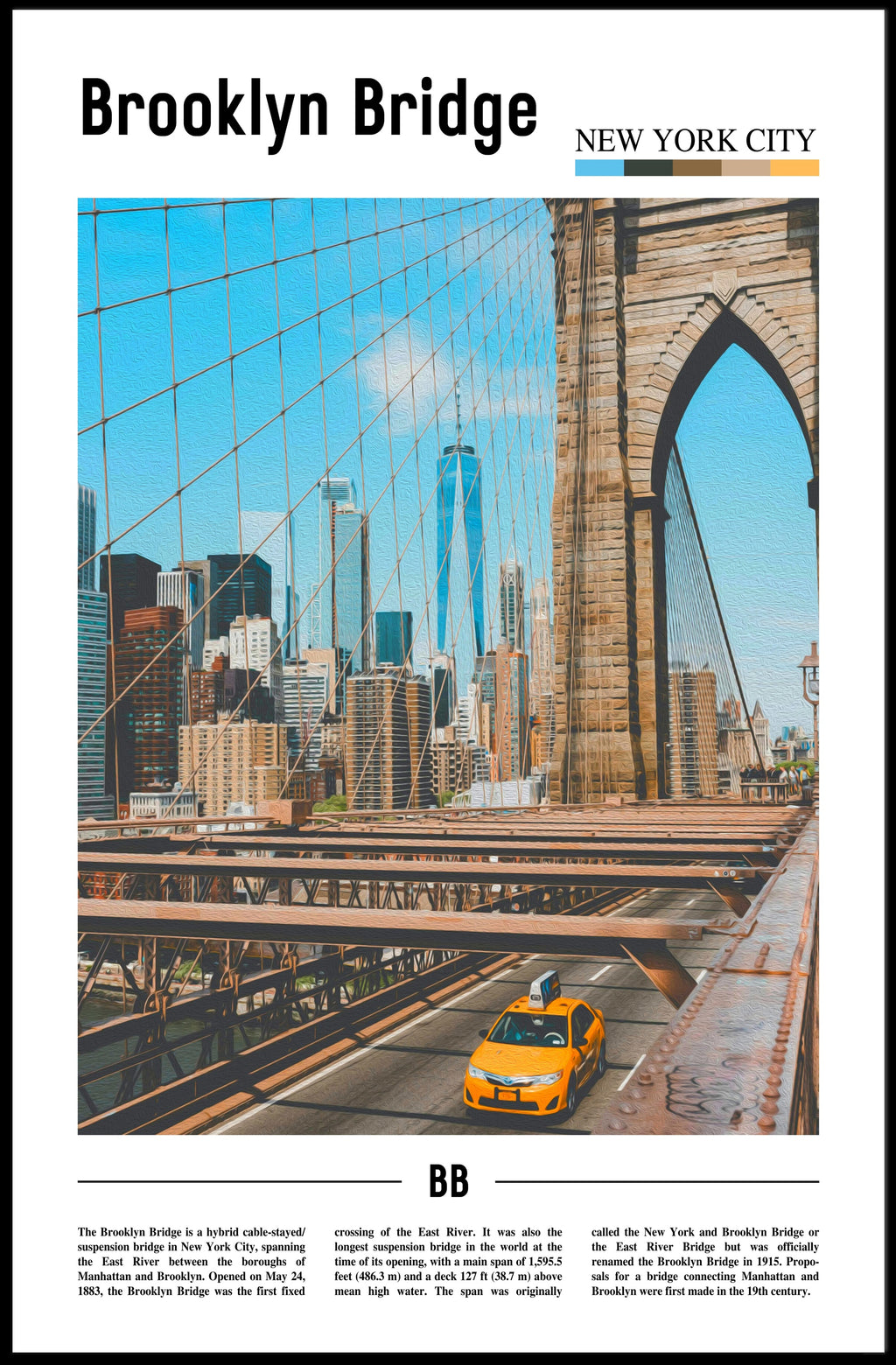 Why you’ll love it: The poster’s dynamic perspective emphasizes the bridge’s soaring arches and taut cable patterns, while the warm tones of the bridge structure contrast with a bright, clear sky and the unmistakable yellow taxi — evoking instant travel inspiration and urban nostalgia. It’s an ideal piece to celebrate iconic landmarks, subway-to-street lifestyle, and New York City art collectors.