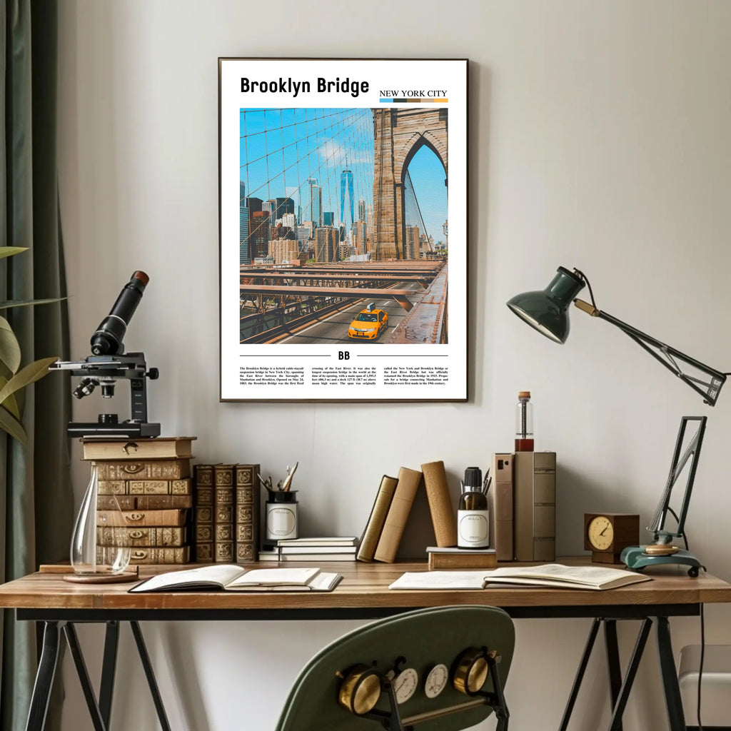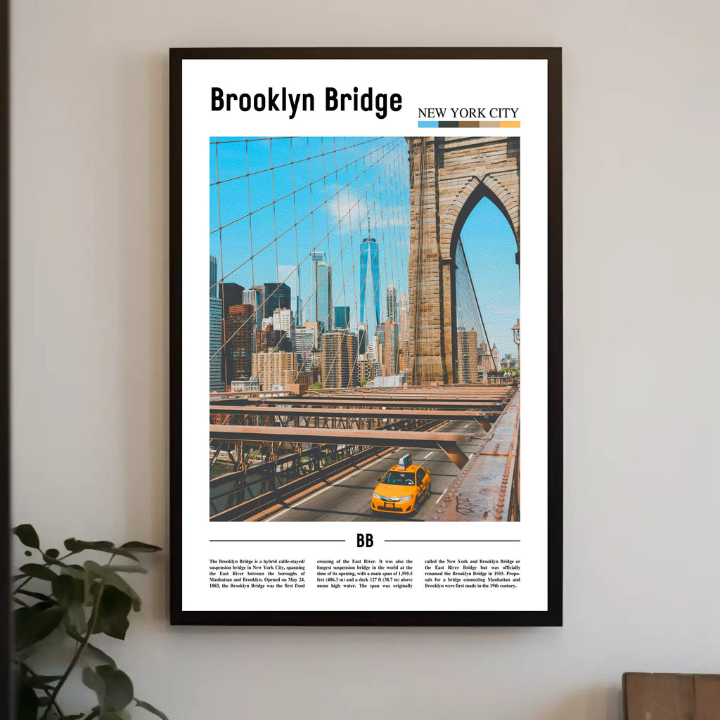 Capture the energy of New York City with the Brooklyn Bridge Modern Cityscape Urban Travel Poster by PosterGoat. This striking poster pairs photorealistic detail with a mid-century modern aesthetic — showcasing the iconic Brooklyn Bridge, its dramatic suspension cables, the Manhattan skyline beyond, and a signature yellow taxi rolling across the roadway for authentic city vibe.