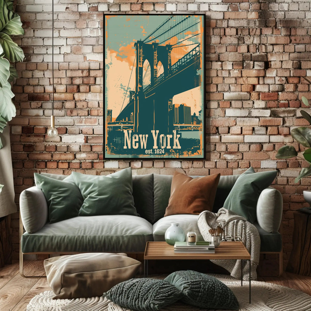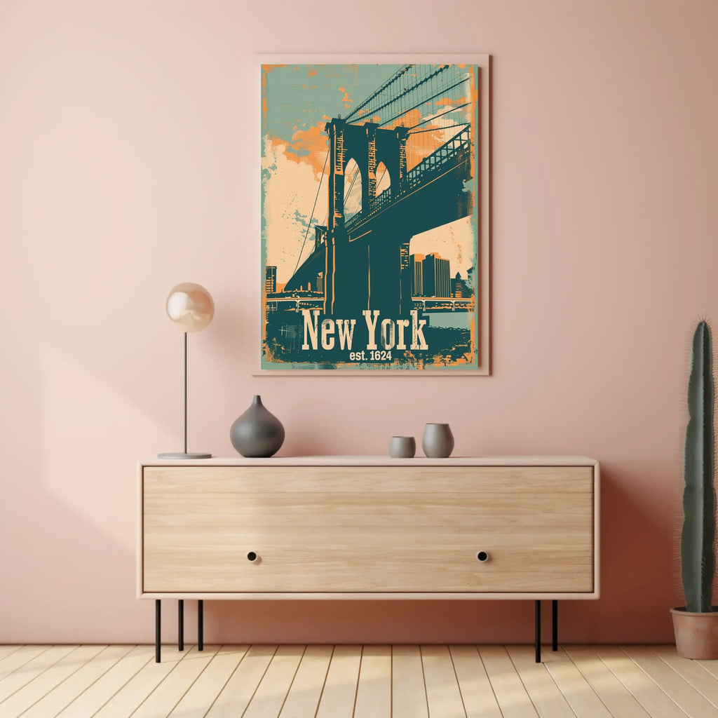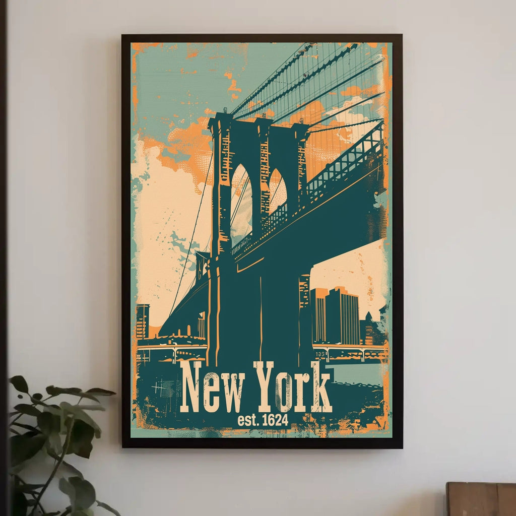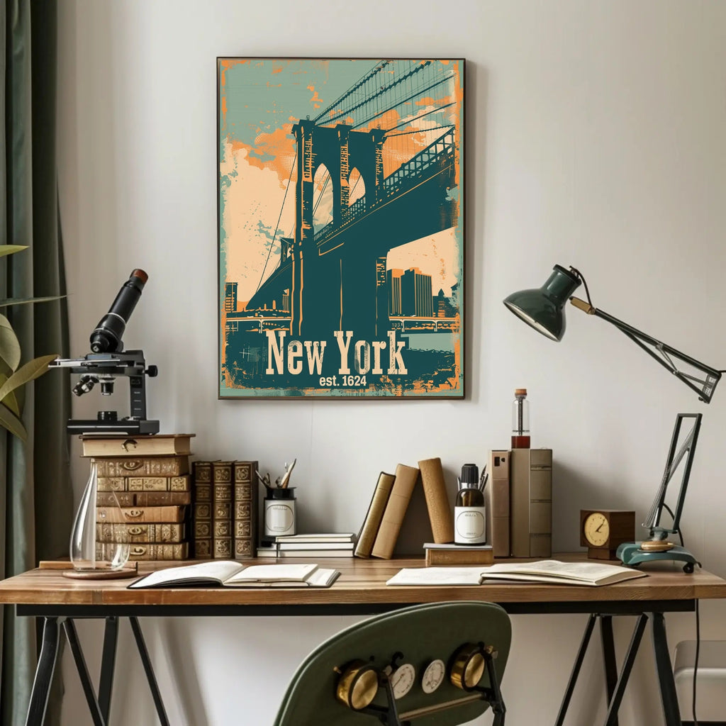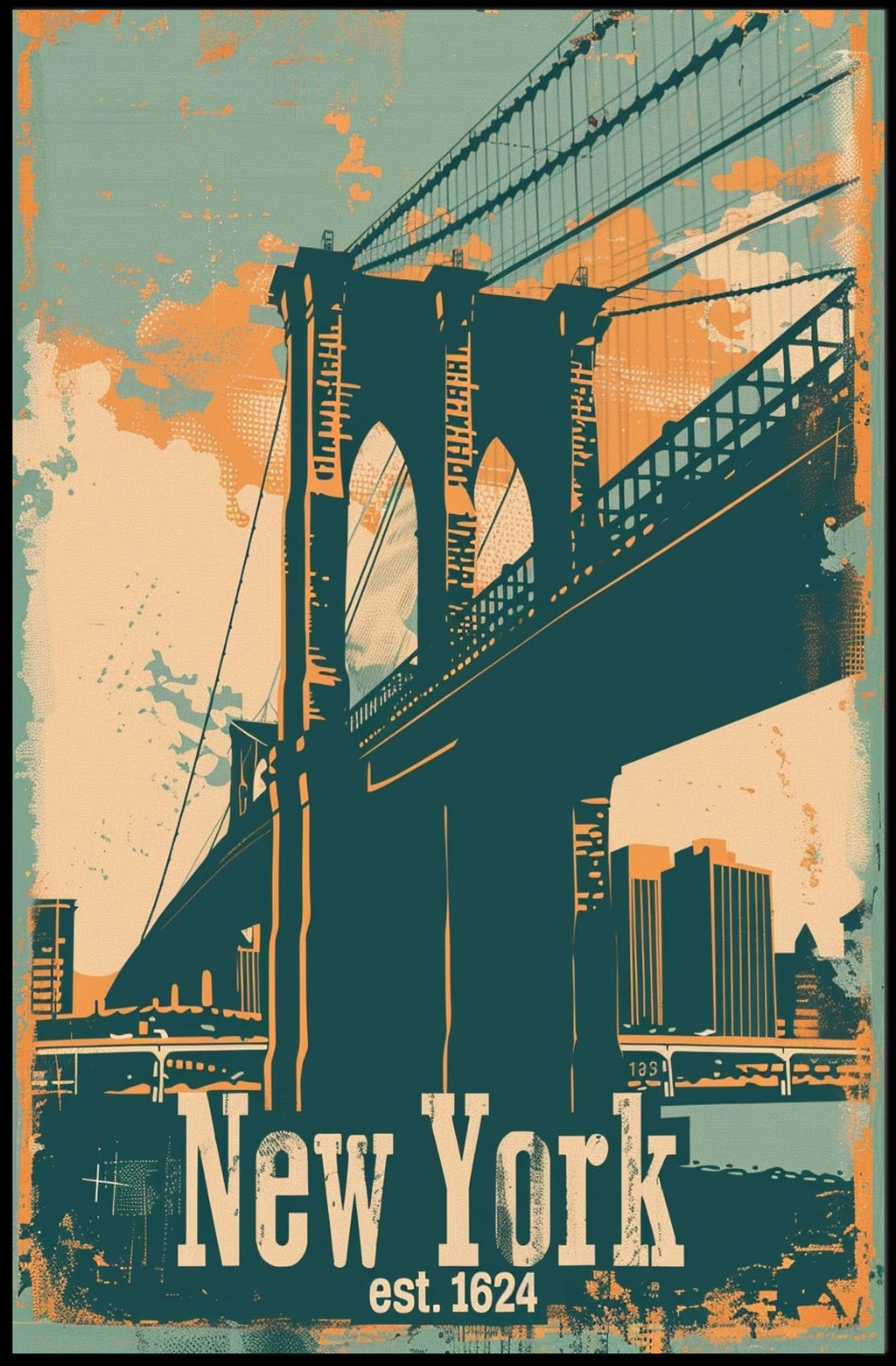 Capture the spirit of New York with the Brooklyn Bridge Vintage Urban Cityscape Poster from PosterGoat — a bold, nostalgic tribute to one of the world’s most iconic landmarks. This artful poster pairs classic typography with a grunge, distressed texture and a striking teal-and-orange palette to create an eye-catching focal point for any room.