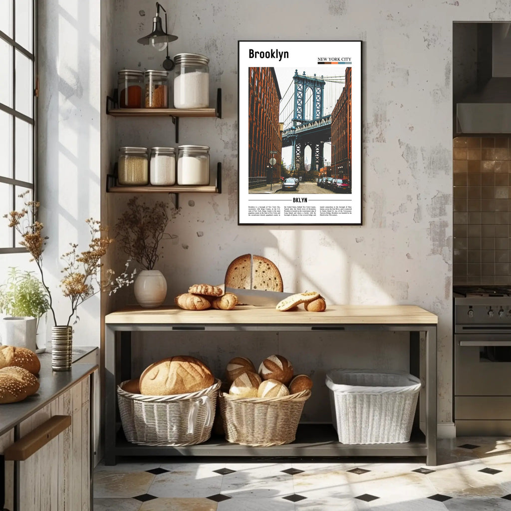Brooklyn Dumbo Manhattan Bridge Travel Poster by PosterGoat brings the heart of New York City into your home with striking architectural poster photography. This photorealistic travel poster frames the Manhattan Bridge as seen from Dumbo, capturing the bridge’s steel arches and the red-brick warehouse streets that make this view instantly iconic.