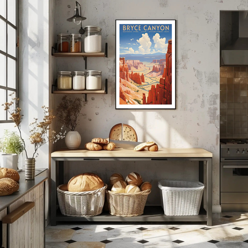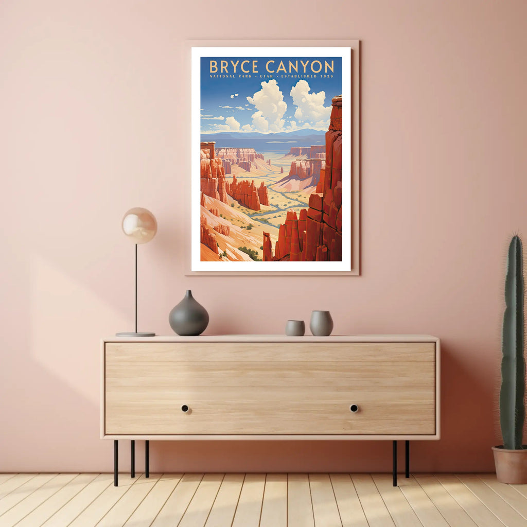 Bring the dramatic red-rock hoodoos and sweeping canyon vistas of Bryce Canyon into your home with this vintage-inspired travel poster from PosterGoat. Designed with a minimalist, retro aesthetic, the print captures sunlit sandstone spires, winding desert valleys, and billowing summer clouds in a warm, painterly palette that elevates any wall.