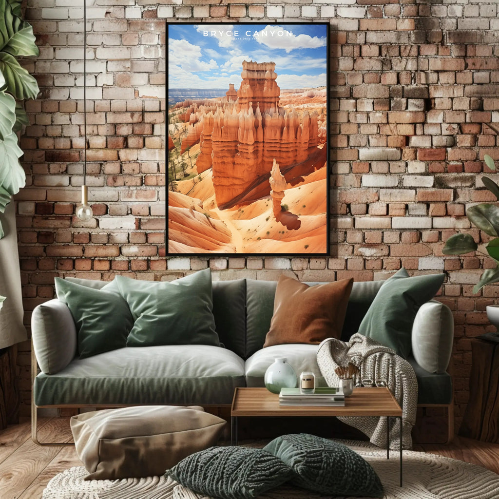 Bring the dramatic, sunlit spires of Bryce Canyon into your living space with this minimalist travel poster from PosterGoat. Rich, high-resolution artwork captures the towering hoodoos, soft sand ridges and a brilliant blue sky, creating a striking focal point that elevates any room, office, or travel-themed gallery wall.
