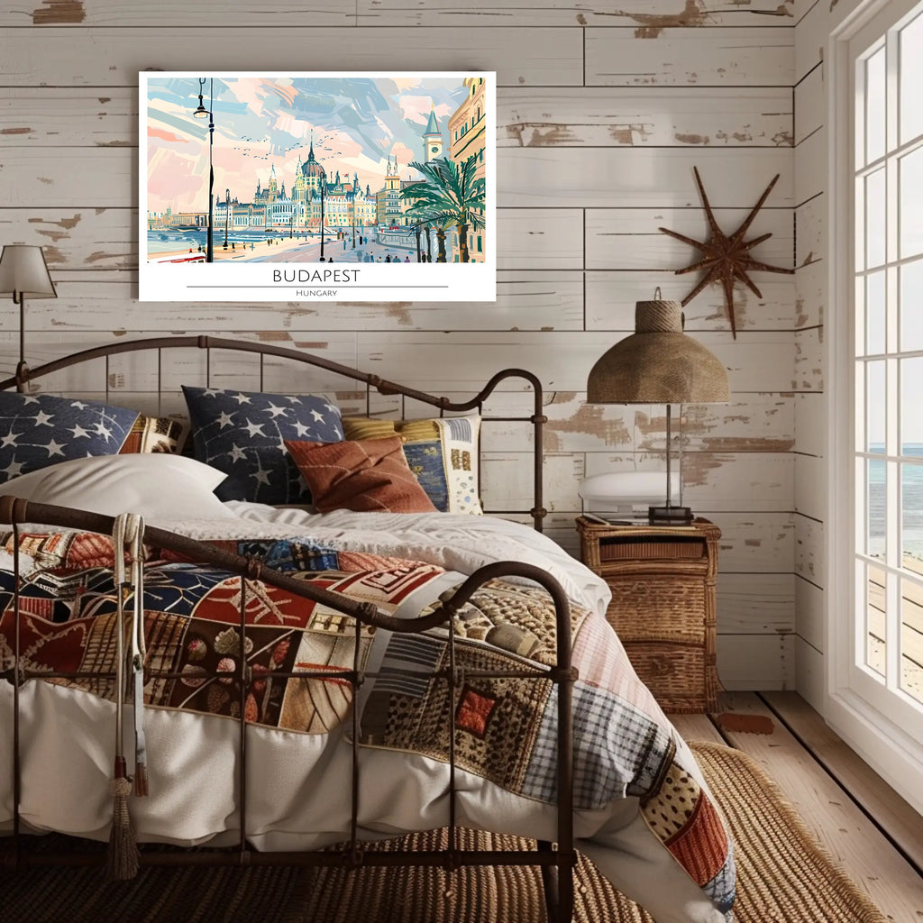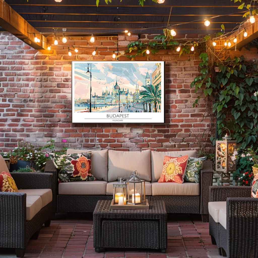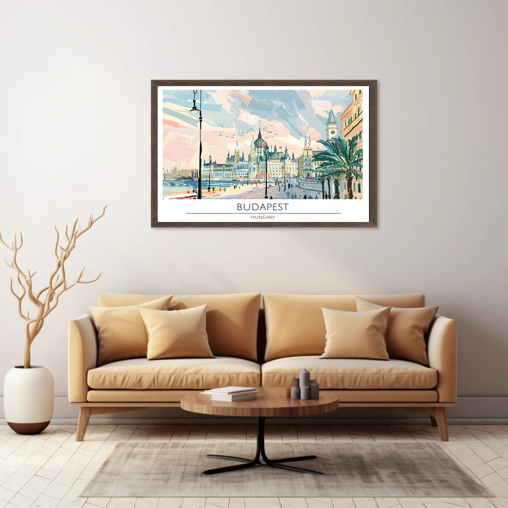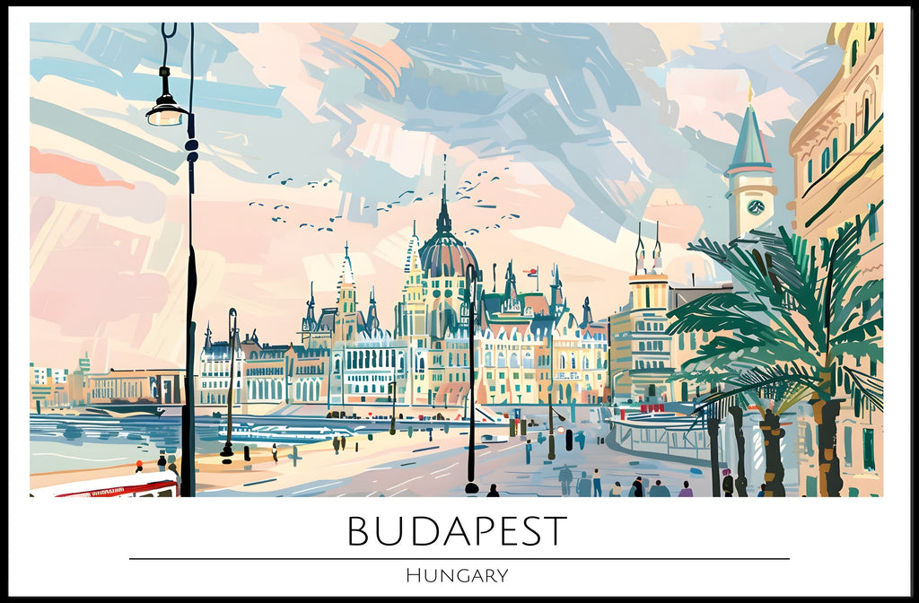 Bring the charm of the Danube to your wall with the Budapest Cityscape Poster by PosterGoat — a modern, minimalist art print that captures the iconic riverside skyline in soft pastel tones and confident brush-stroke detail. This scenic cityscape print highlights Budapest’s ornate architecture, riverside promenade, elegant lampposts and palm-lined walkways in a clean, travel-poster composition that complements both contemporary and industrial interiors.