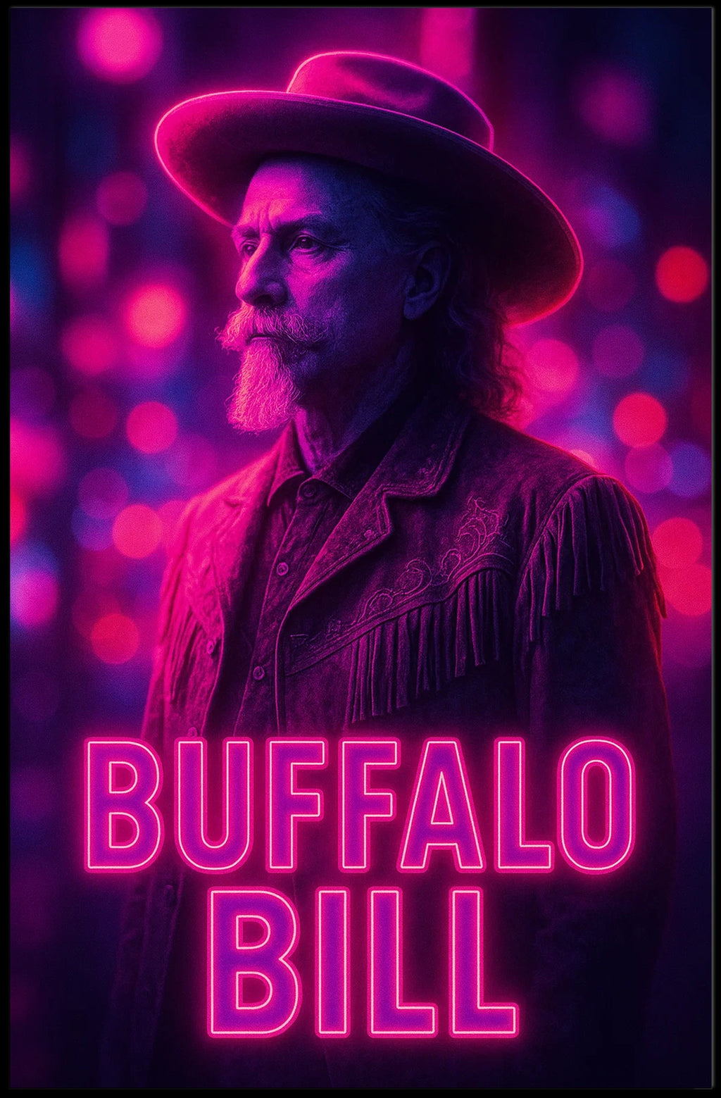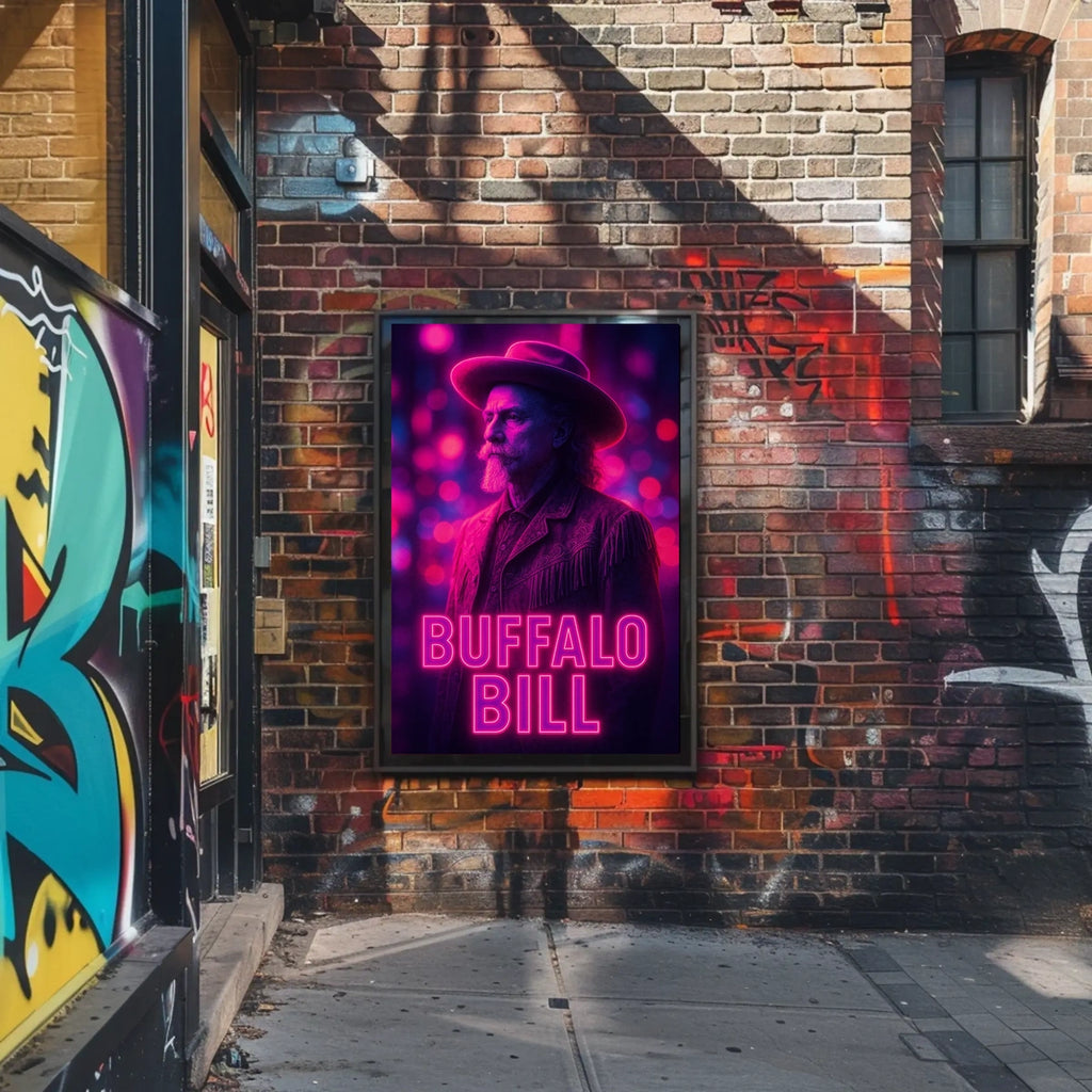 Immerse yourself in the captivating era of the American West with this vibrant Buffalo Bill Iconic American Pop Culture Poster. Dressed impeccably in a fringed jacket and broad-brimmed hat, the figure embodies the spirit of adventure and folklore synonymous with the Wild West. The bold neon pink text highlights the name "BUFFALO BILL," adding a contemporary and striking twist to the legendary persona. Perfect for fans of Western culture and pop art enthusiasts, this design delivers a dynamic fusion of history and modernity, making it a statement piece for any décor.