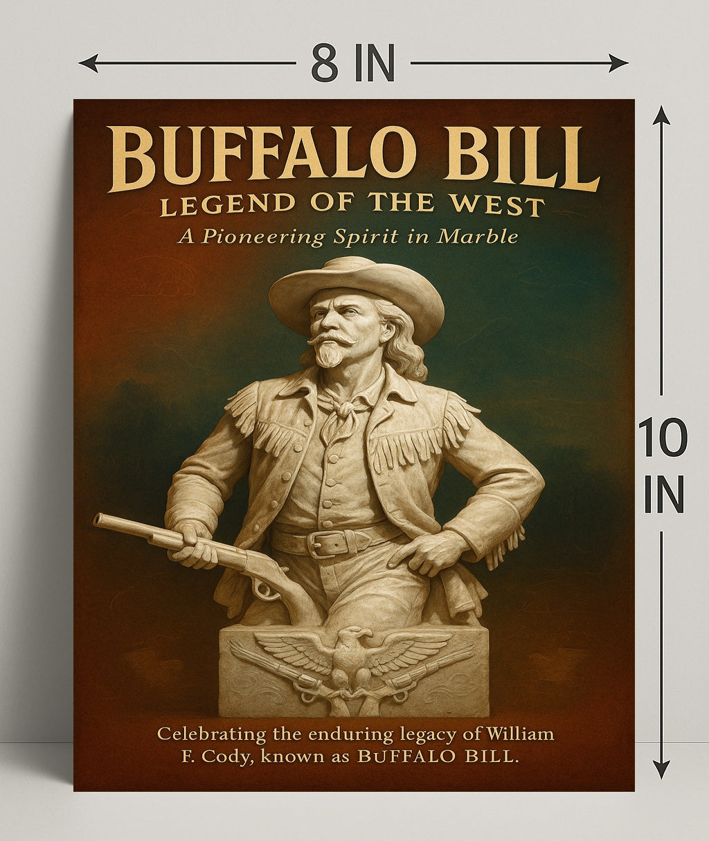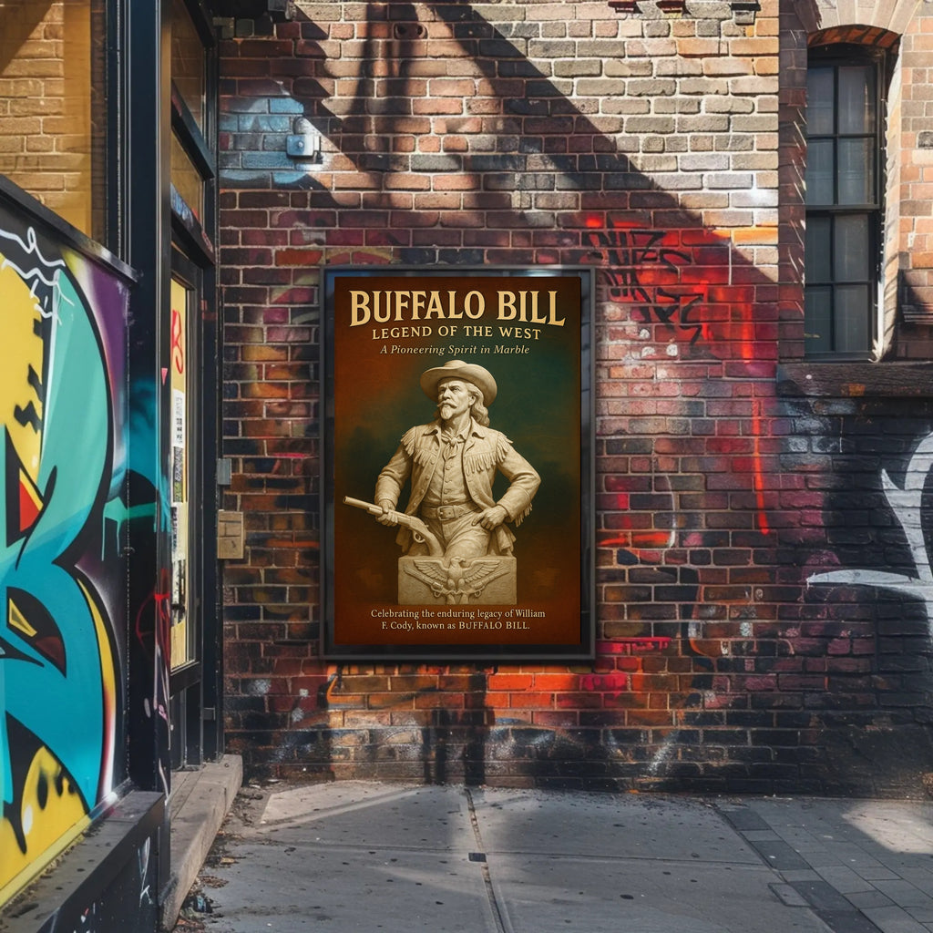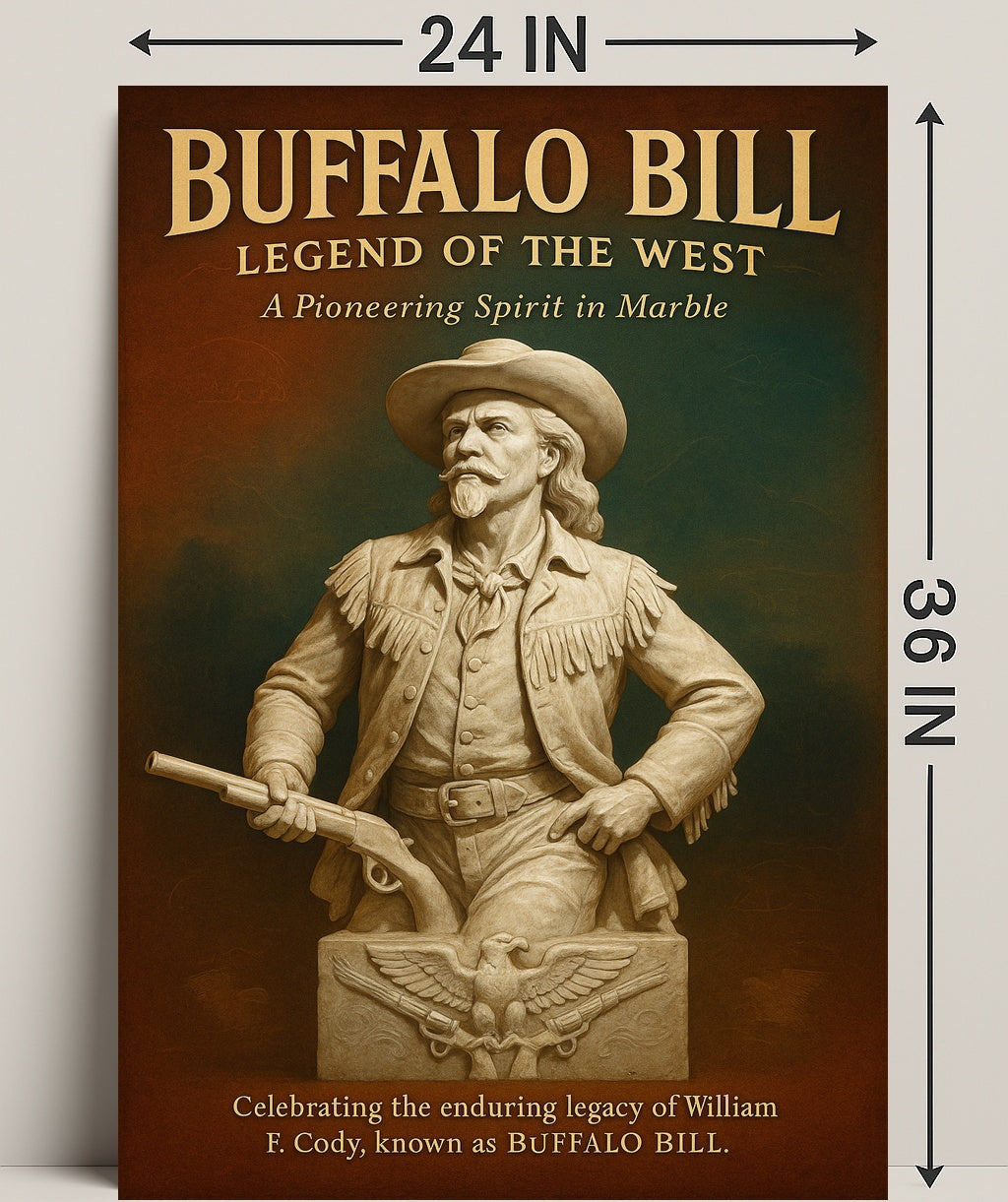 Buffalo Bill Marble Statue American Heritage Poster from PosterGoat is a striking wall art piece that honors the enduring legend of the Wild West. This timeless poster captures the spirit of William F. Cody, famed as Buffalo Bill, in a marble statue-inspired design.