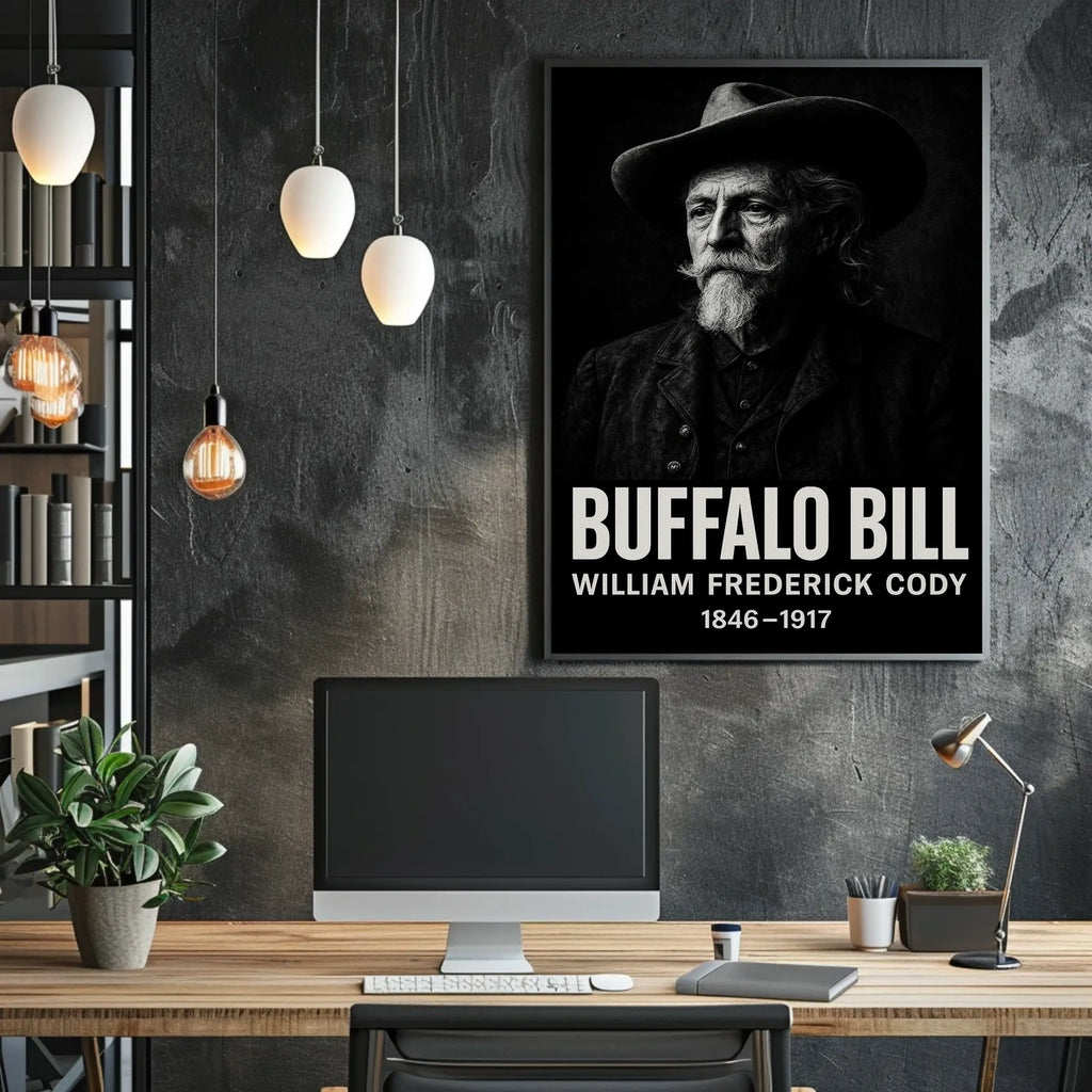 This unique monochrome poster captures the essence of the legendary Buffalo Bill, showcasing a thoughtfully stylized portrayal that reflects cultural heritage and historical significance. The dignified image of the man with a mustache, long hair, and distinct attire transports you to an era of exploration and charisma. Ideal for history buffs and art enthusiasts, this poster integrates seamlessly into contemporary décor while celebrating a timeless icon. Its sophisticated design promises to evoke admiration and fascination, making it an excellent addition to any gallery wall or themed space. Perfect for gifting to those who appreciate historical depth and refined aesthetics.