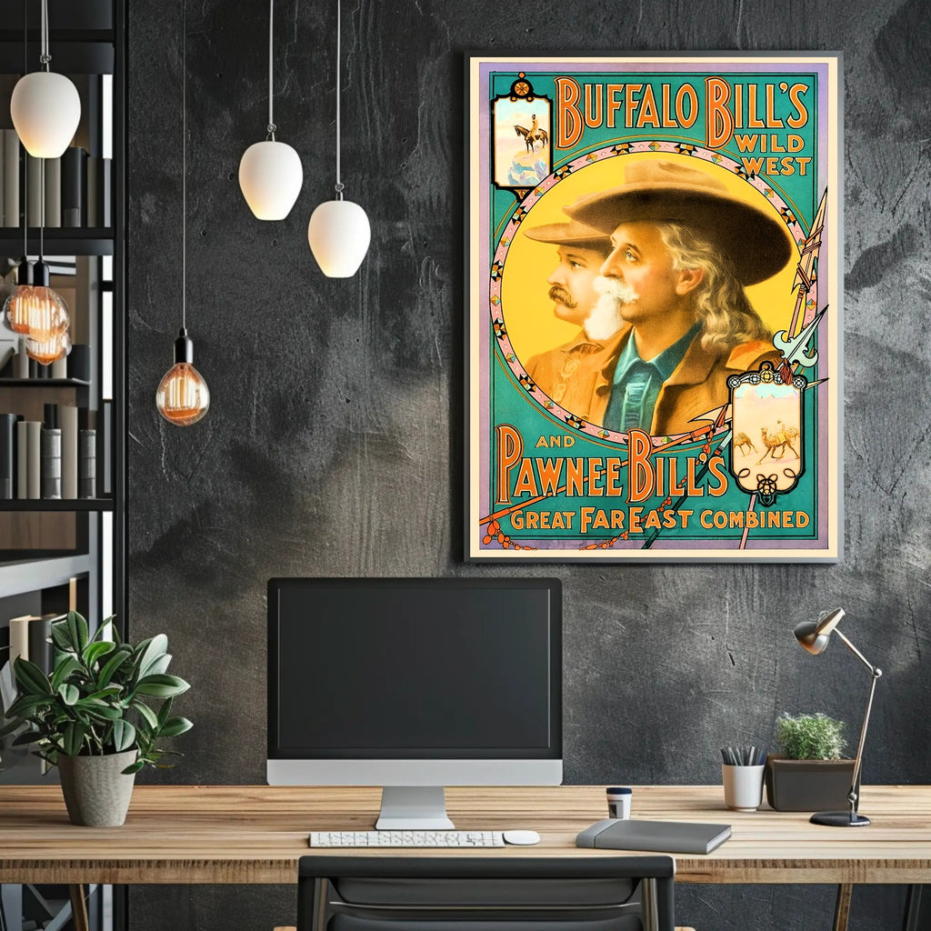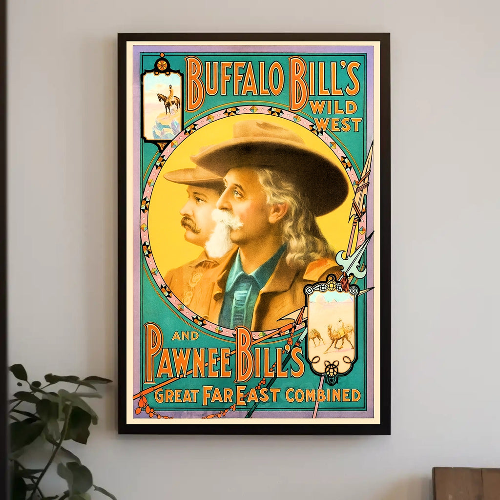 Capture a piece of Americana with PosterGoat's Buffalo Bill's Wild West and Pawnee Bill's Great Far East Combined art print. This bold, color-saturated design pairs two legendary showmen within a decorative circular frame, delivering a vintage travel-poster vibe for modern walls.
