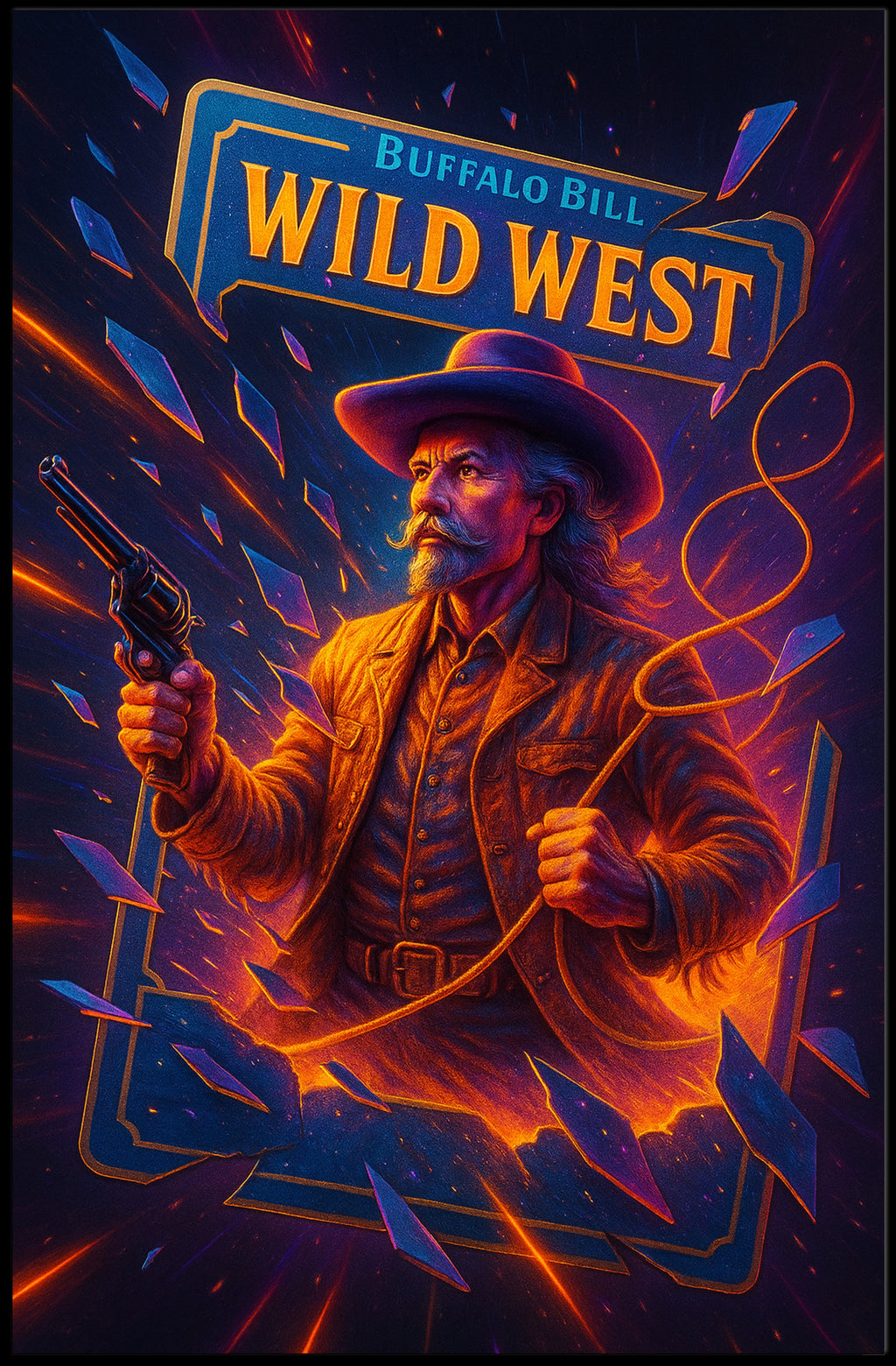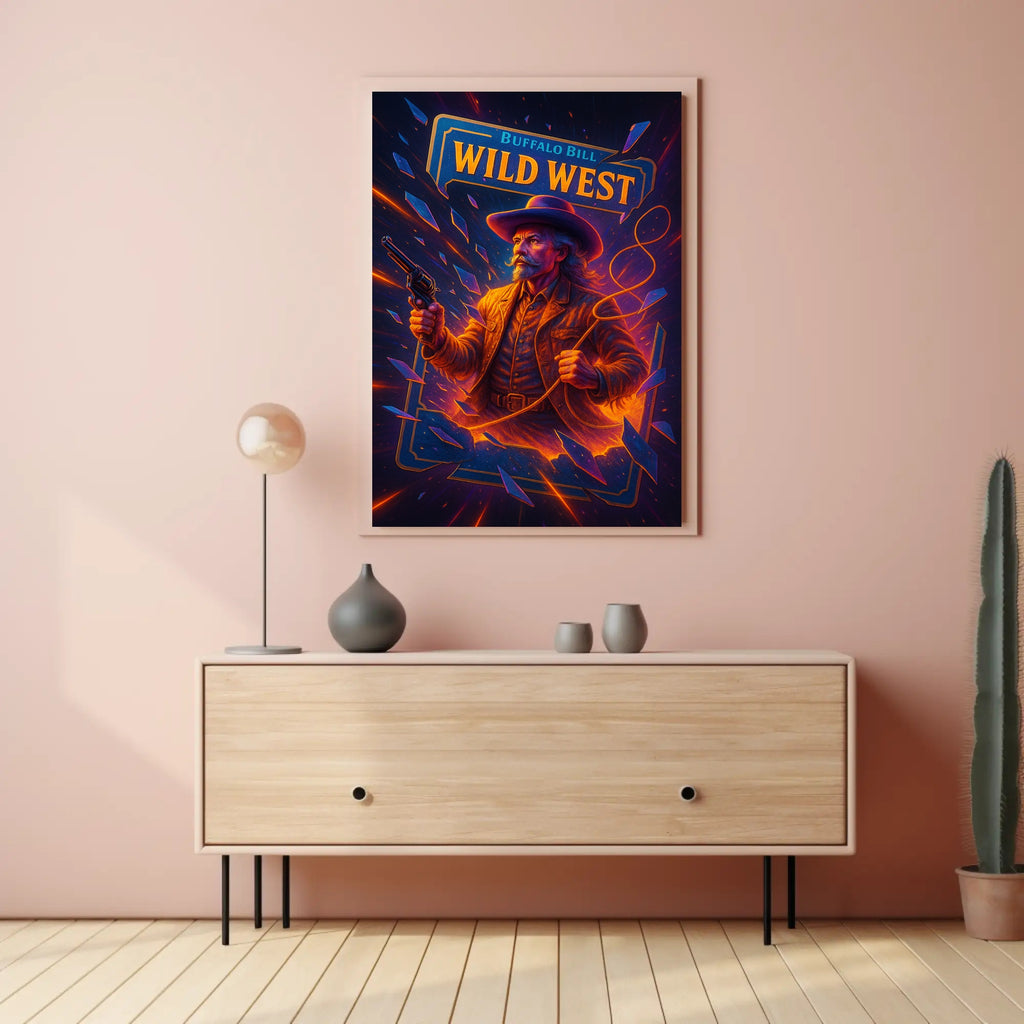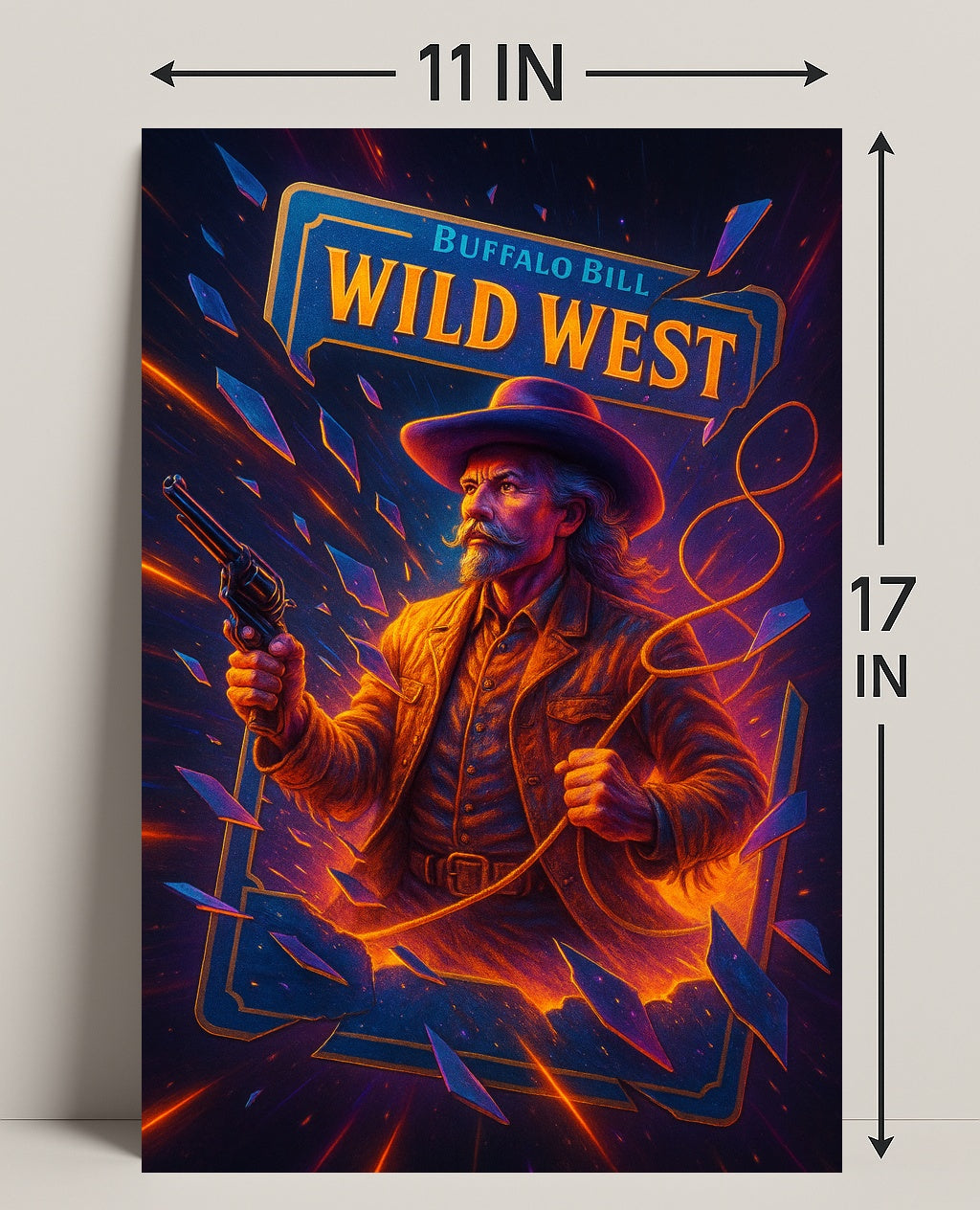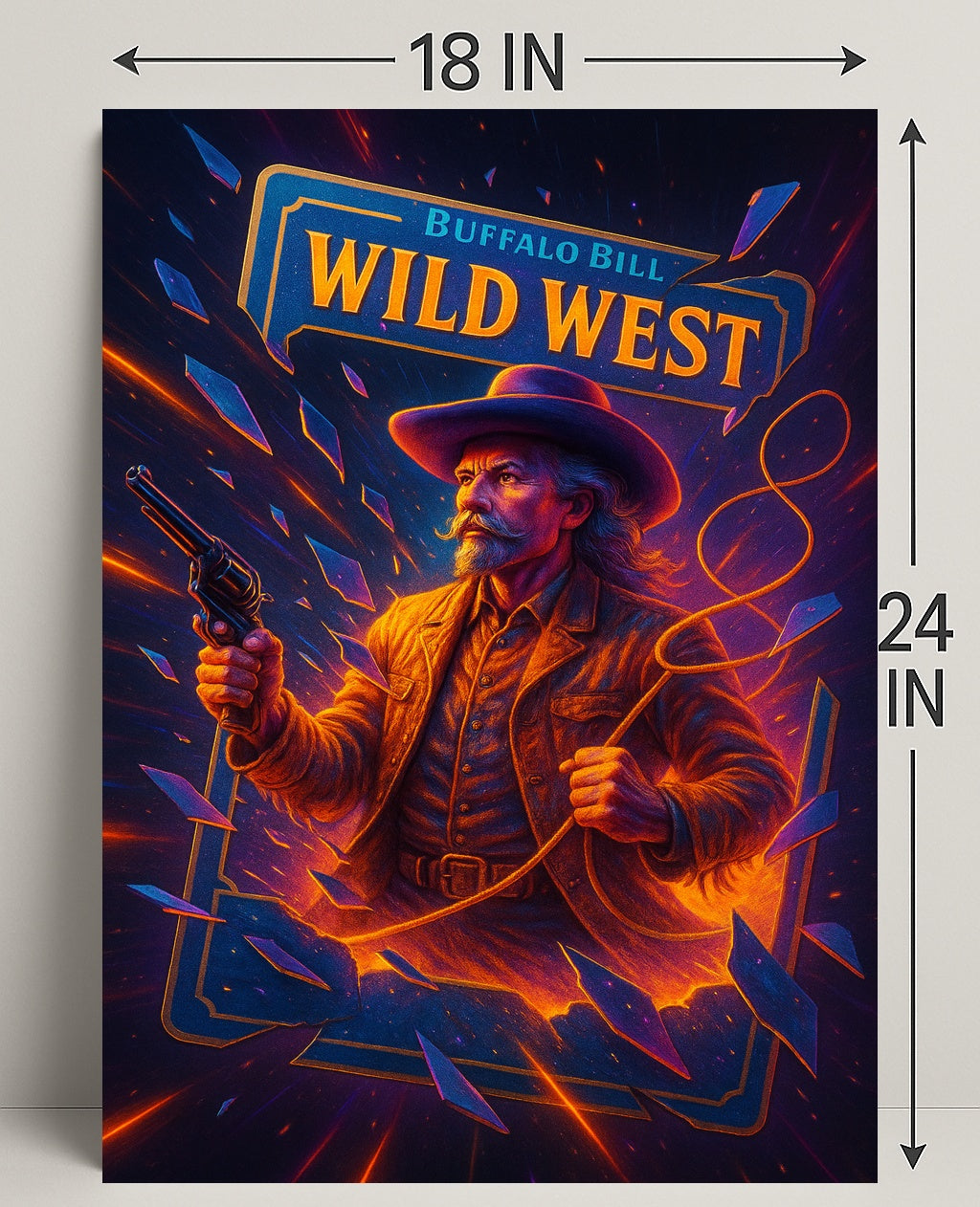 Bring the daring frontier into your space with the Buffalo Bill Wild West Vintage Wall Art Print from PosterGoat. This cinematic poster captures Buffalo Bill mid-action—hat tipped, pistol raised and lariat in hand—set against a dramatic backdrop of glowing orange and deep indigo that radiates energy and motion.