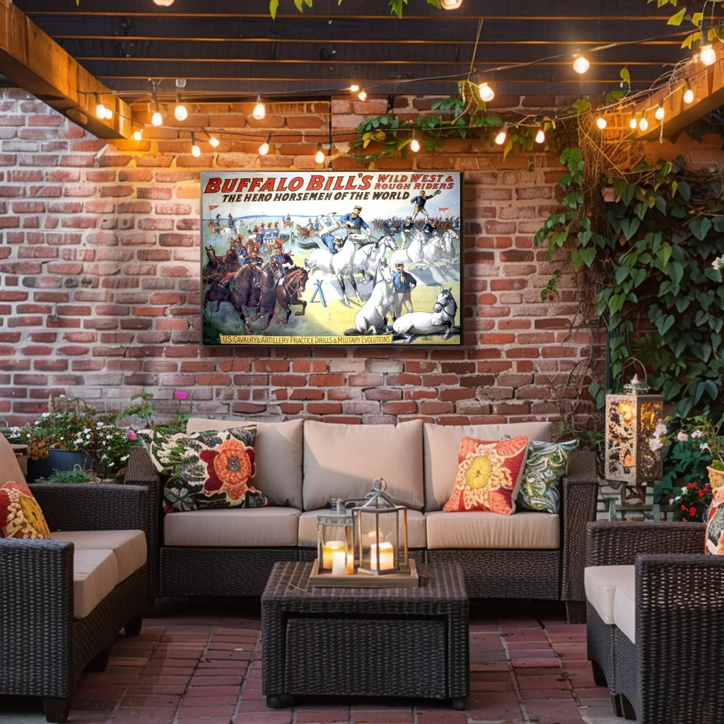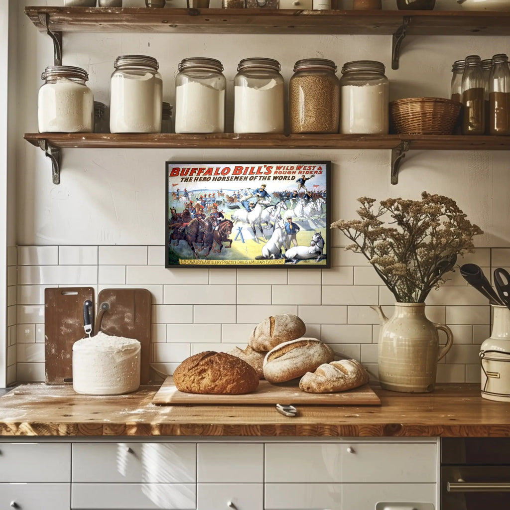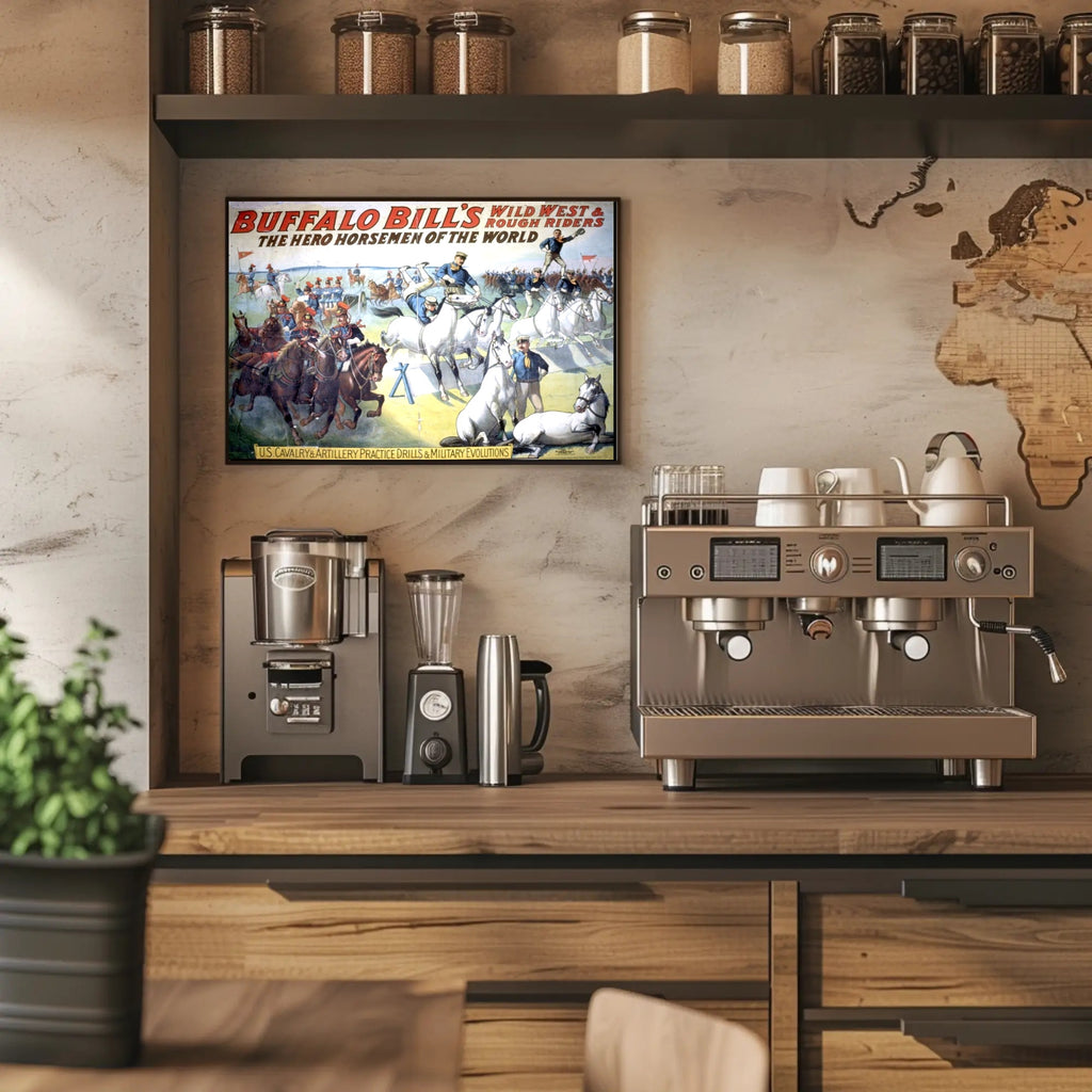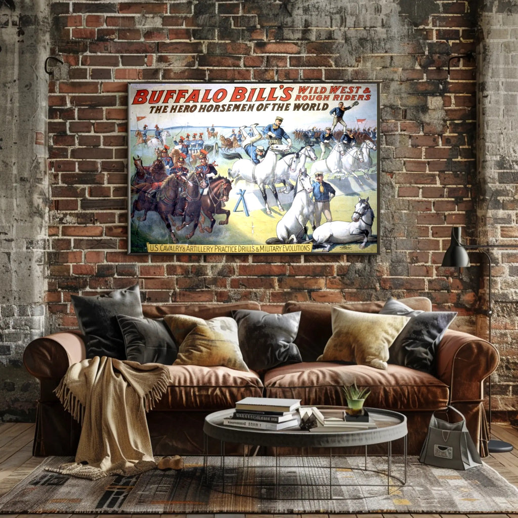 Designed to be the centerpiece of any room, this 18x24-inch art print fits most standard frames and wall spaces. The dynamic composition brings Buffalo Bill’s era to life—charging horsemen, precise formations, and lively action—making it a dramatic addition to living rooms, offices, cafes, or entertainment nooks.