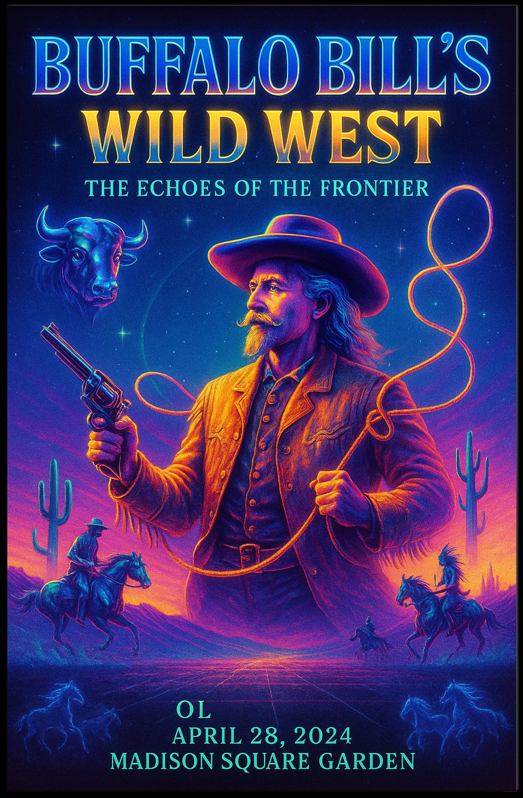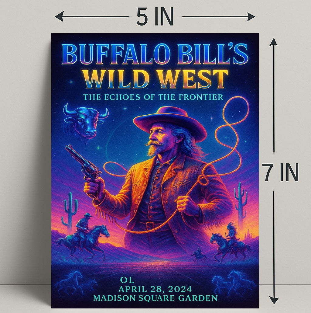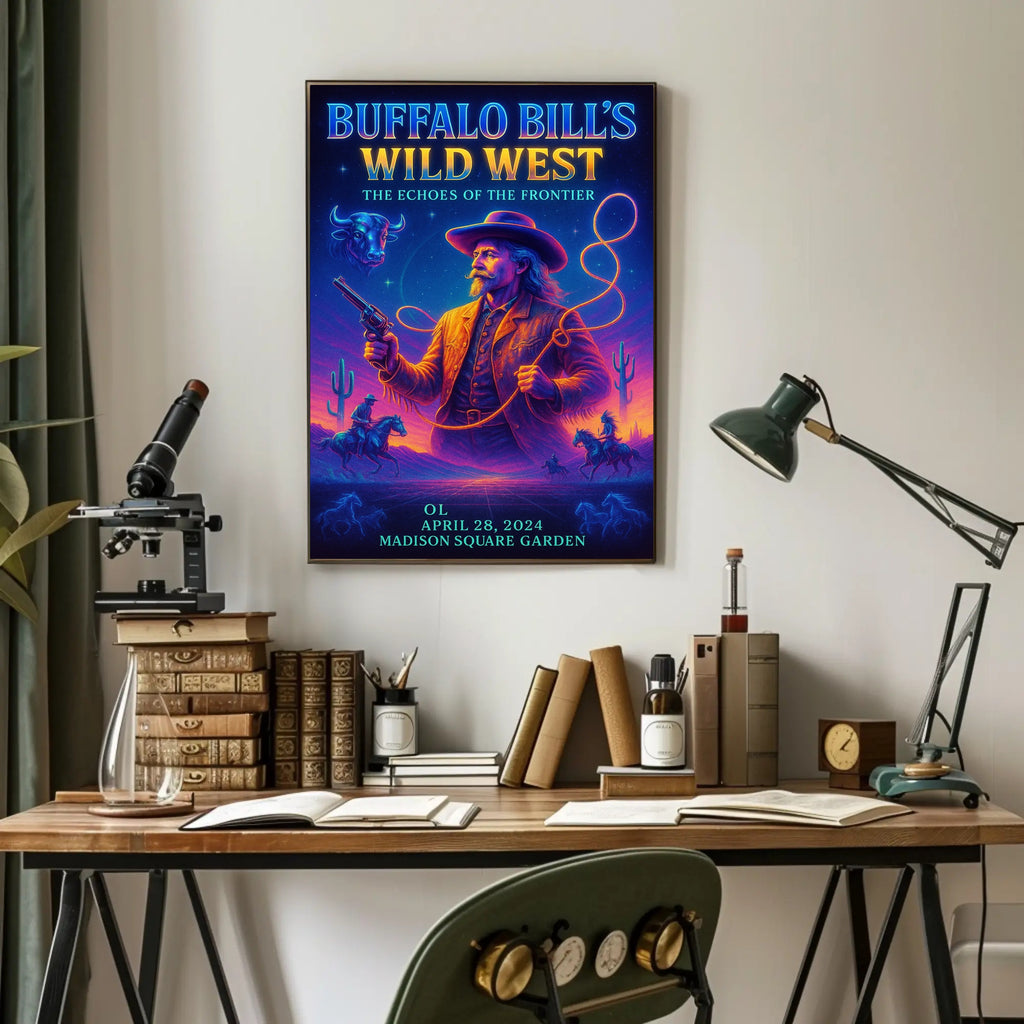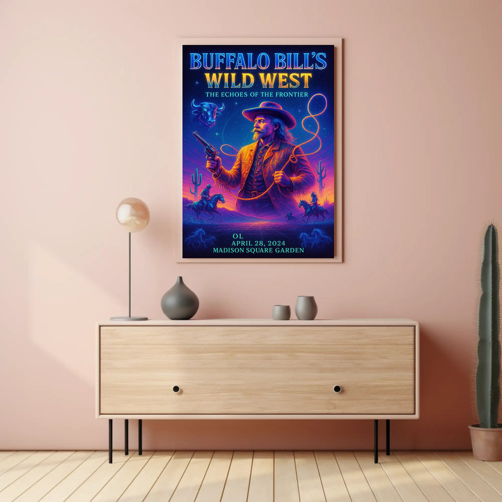 Relive the iconic frontier spirit with Buffalo Bill's Wild West Show Art Print Wall Decor from PosterGoat. This striking poster merges a vintage show-poster vibe with a bold neon glow, turning any wall into a dramatic gallery of the American West.