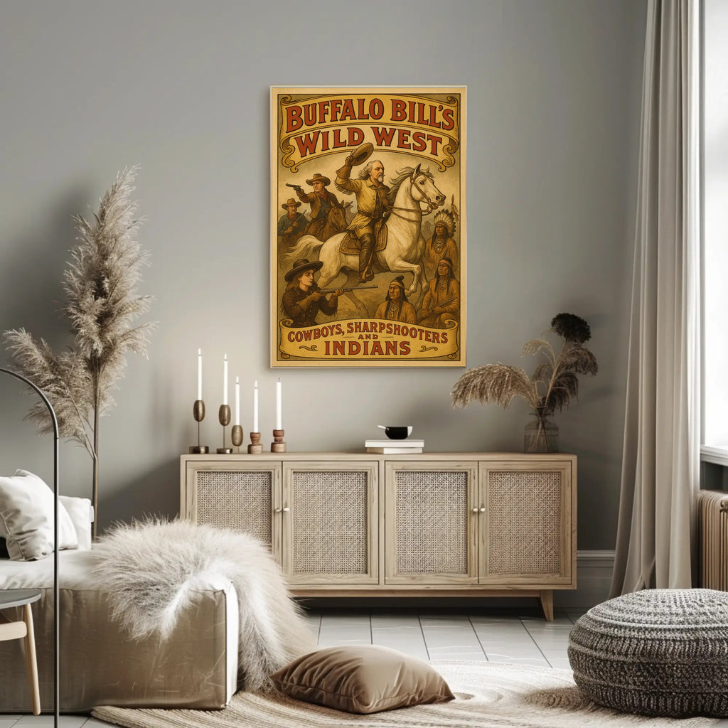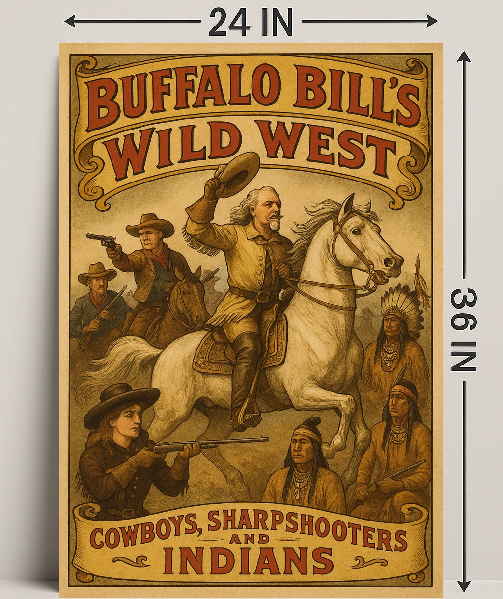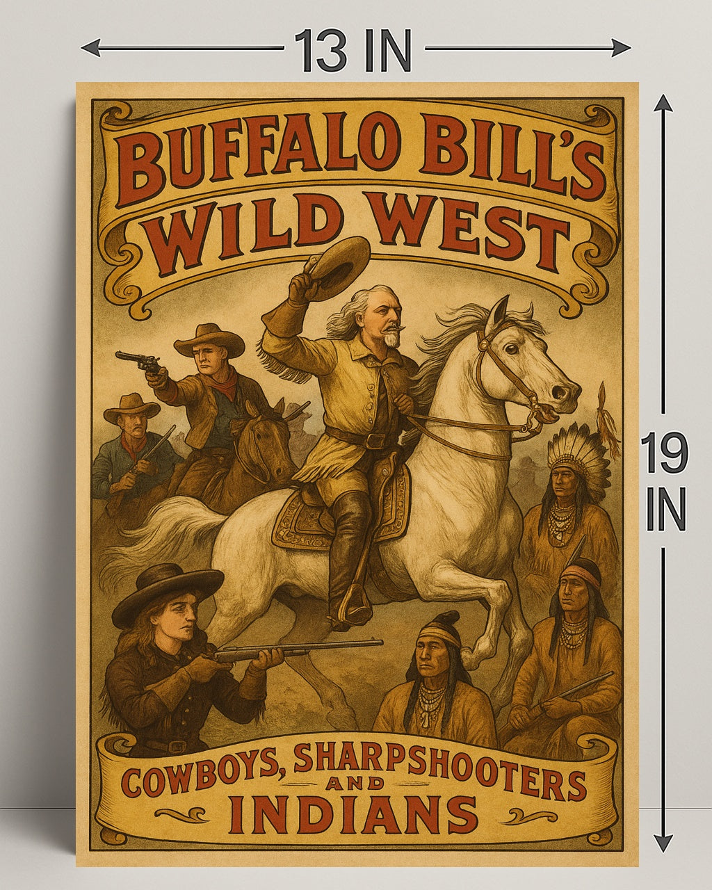 Step back into the frontier era with the Buffalo Bills Wild West Show Vintage Poster Print by PosterGoat. This richly detailed, sepia-toned reproduction captures the drama of a mounted rider at the center of a vibrant Western tableau—surrounded by cowboys, sharpshooters, and Indigenous figures—creating a bold centerpiece for any wall.