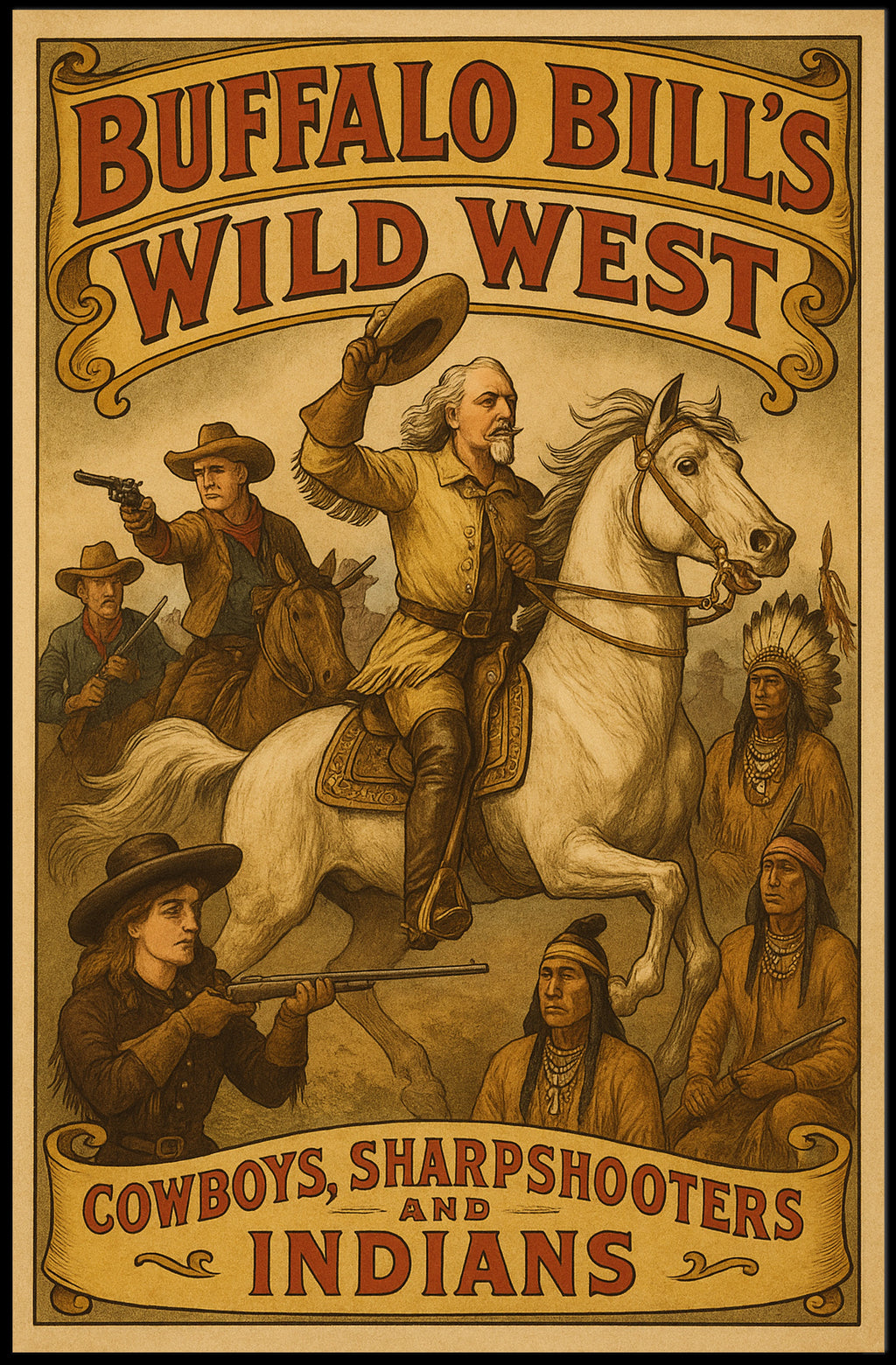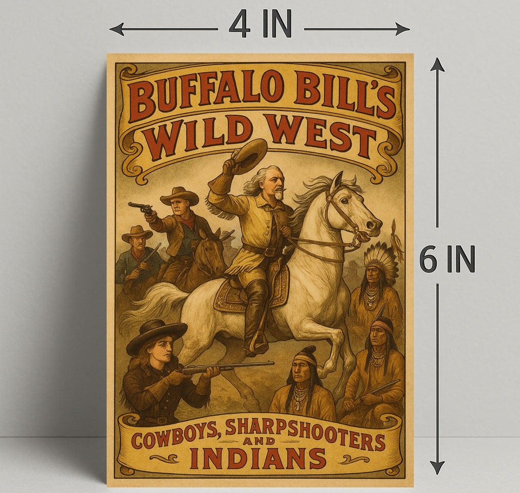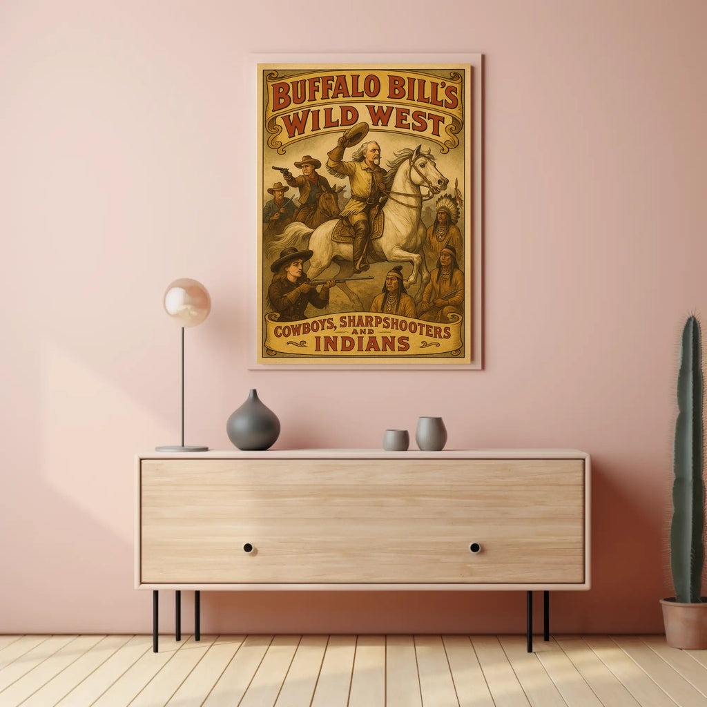Step back into the frontier era with the Buffalo Bills Wild West Show Vintage Poster Print by PosterGoat. This richly detailed, sepia-toned reproduction captures the drama of a mounted rider at the center of a vibrant Western tableau—surrounded by cowboys, sharpshooters, and Indigenous figures—creating a bold centerpiece for any wall.