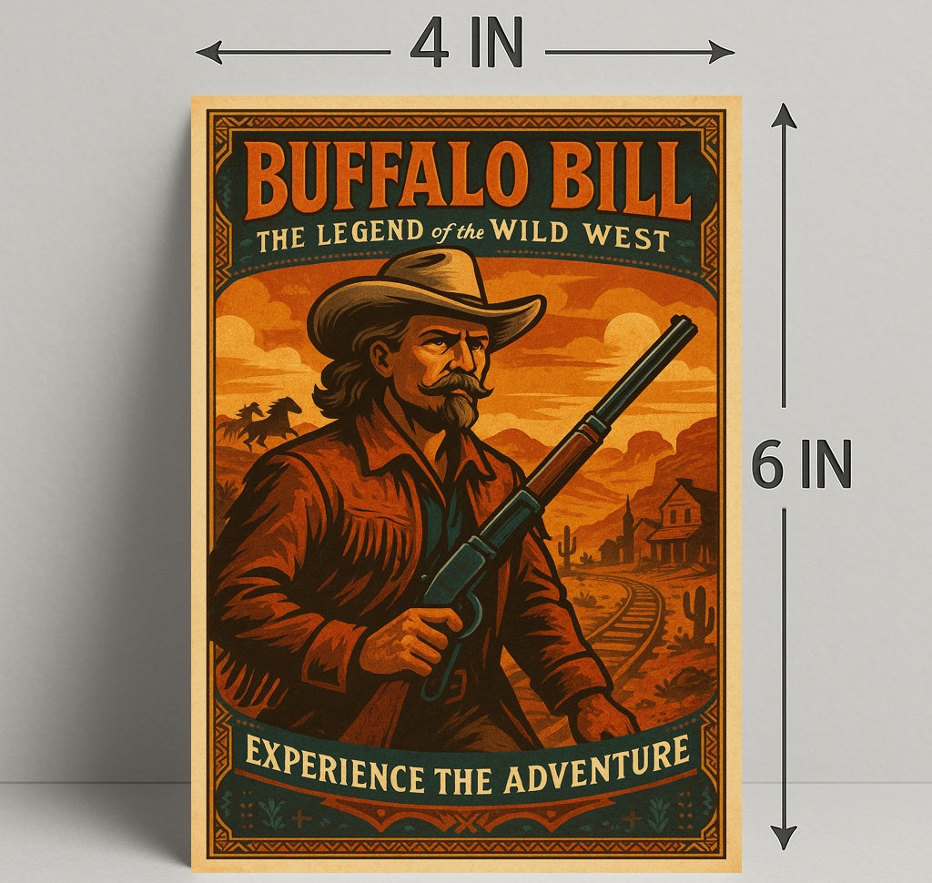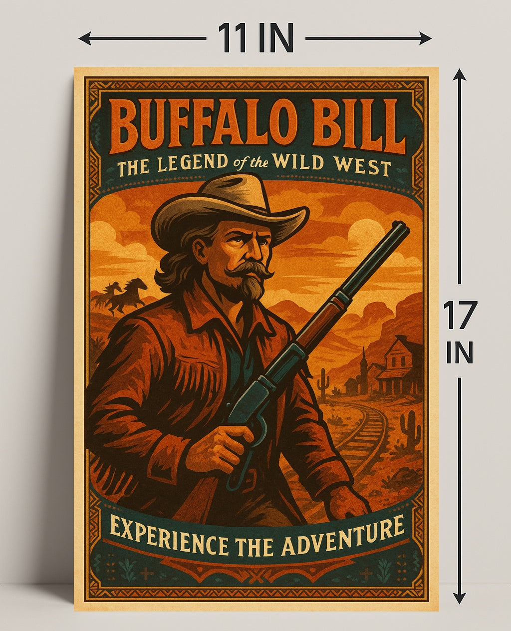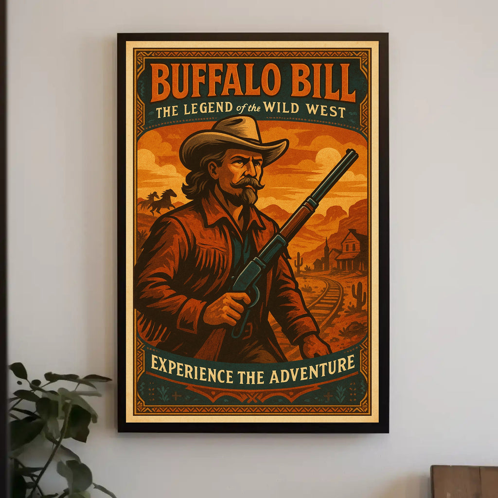Celebrating a Wild West legend, this print blends retro charm with modern print quality. The central portrait of Buffalo Bill stands tall against a landscape of cacti and distant town silhouettes, framed by decorative borders and a sweeping banner that proclaims “Experience the Adventure.” A standout addition to Home & Garden decor, it brings authentic Western character to living rooms, offices, or gallery walls.