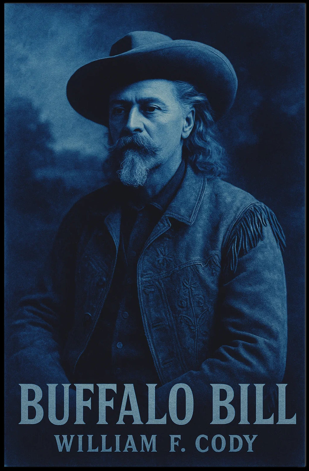 - Detailed design highlighting Buffalo Bill's iconic features — mustache art, fringe jacket, and frontier showman flair