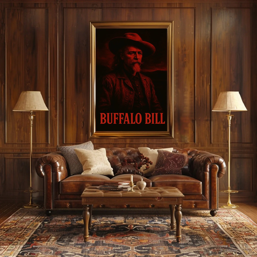 Buffalo Bill Western Heritage Historical Poster invites you to step back in time to the American West. This timeless wall art features a stylized portrait of Buffalo Bill, capturing the frontier's adventurous spirit in fringe clothing and a wide-brimmed hat. Bold and evocative, it beautifully represents Western heritage and adds nostalgic charm to any living space, study, or office.