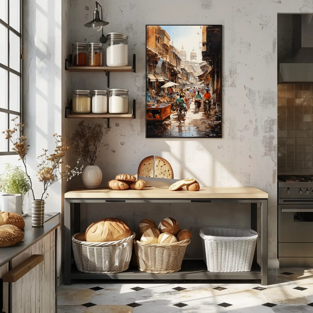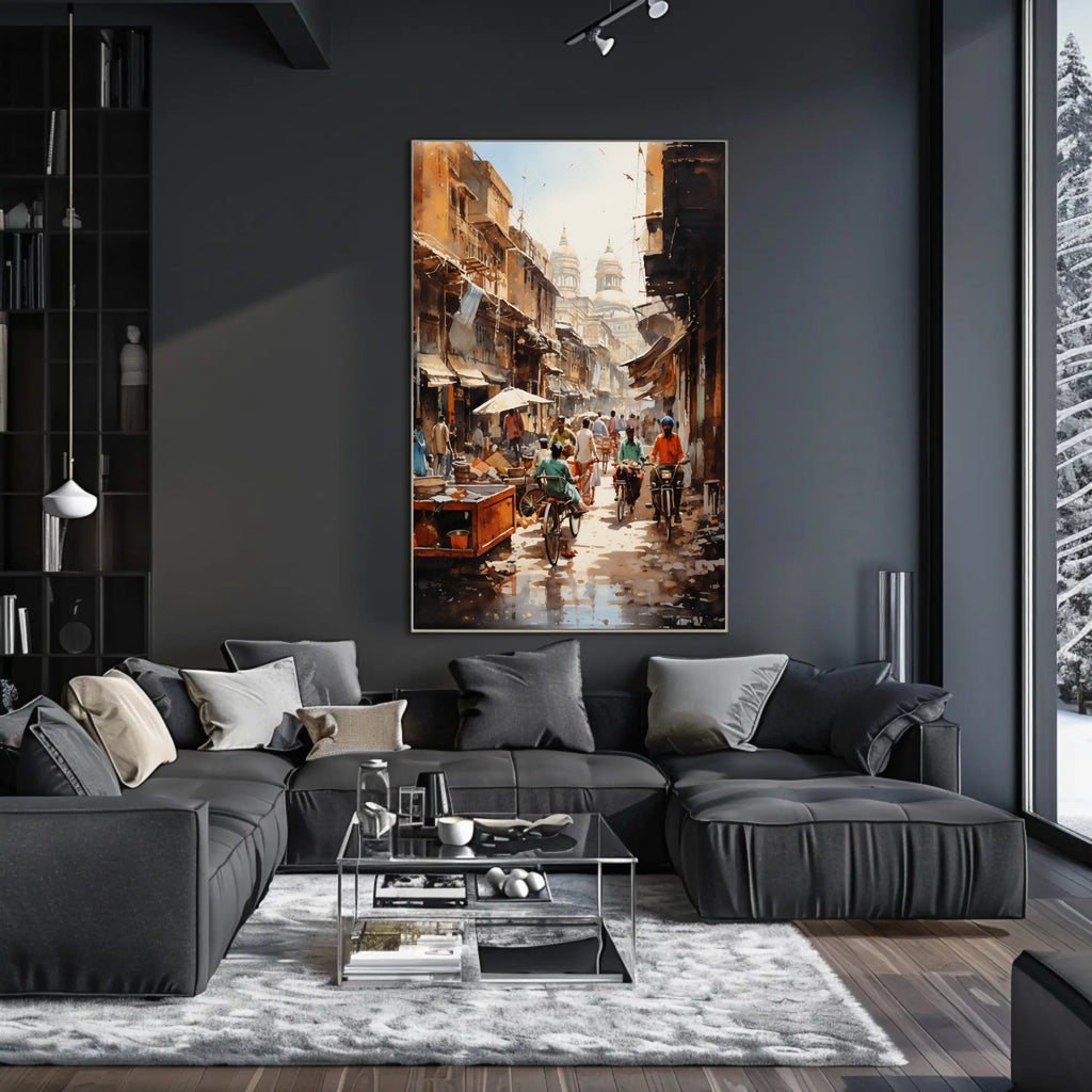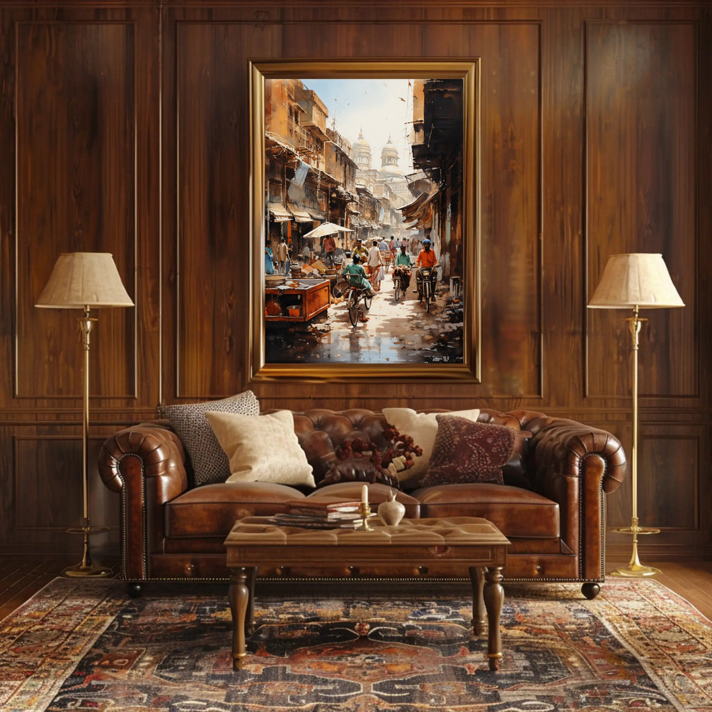 Vibrant scene: Intricate street-level detail—busy stalls, umbrellas, and passersby—creates an immersive, story-rich focal point for living rooms, hallways, or offices.
