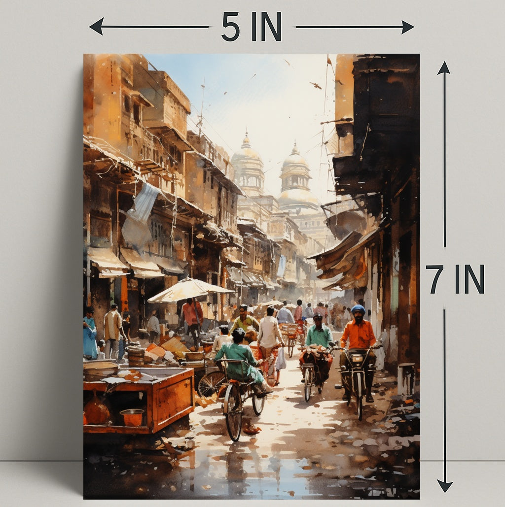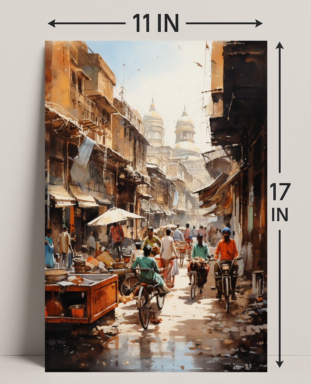 Bring the rhythm of a faraway bazaar into your home with the Bustling Market Street Poster from PosterGoat. This evocative art print captures a sunlit, crowded market street—rickshaws, cyclists and vendors framed by historic domed architecture—rendered in a warm, watercolor-inspired Pop Art style that adds movement and character to any wall.