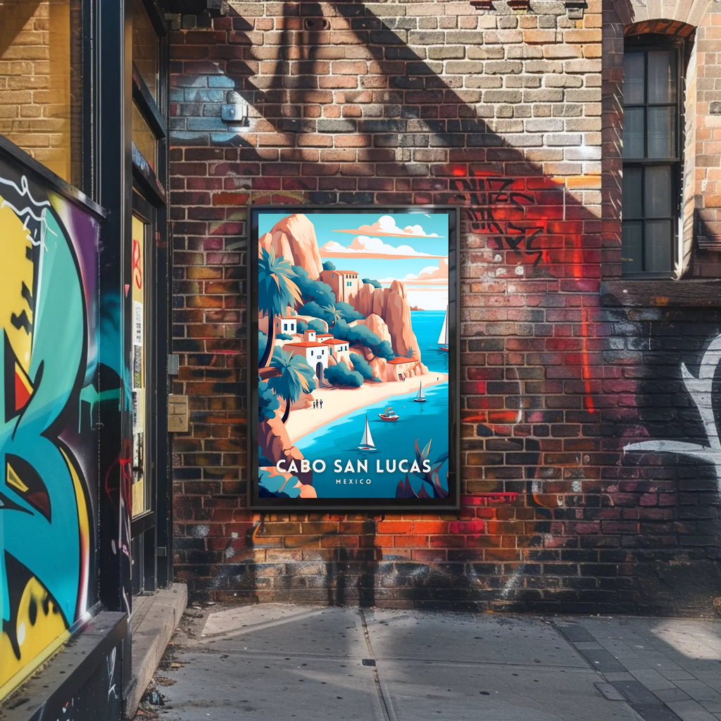 Transport your space to the sun-drenched shores of Baja with the Cabo San Lucas Tranquil Seaside View Travel Poster by PosterGoat. This evocative travel poster captures towering coastal cliffs, white-walled villas with terracotta roofs, swaying palm trees and sailboats drifting across a vivid turquoise sea — a perfect blend of mid-century modern charm and illustrative travel art that brings a relaxing coastal ambiance to any room.