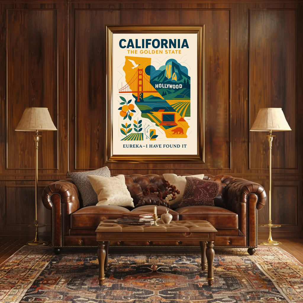 Bold, nostalgic design: This Pop Art–style poster blends the Golden Gate Bridge, the Hollywood sign, coastal cliffs, citrus orchards, agricultural fields, a grizzly silhouette and a nod to Silicon Valley into a cohesive vintage travel aesthetic. The warm golden and teal palette and clean geometric shapes give any wall instant personality.