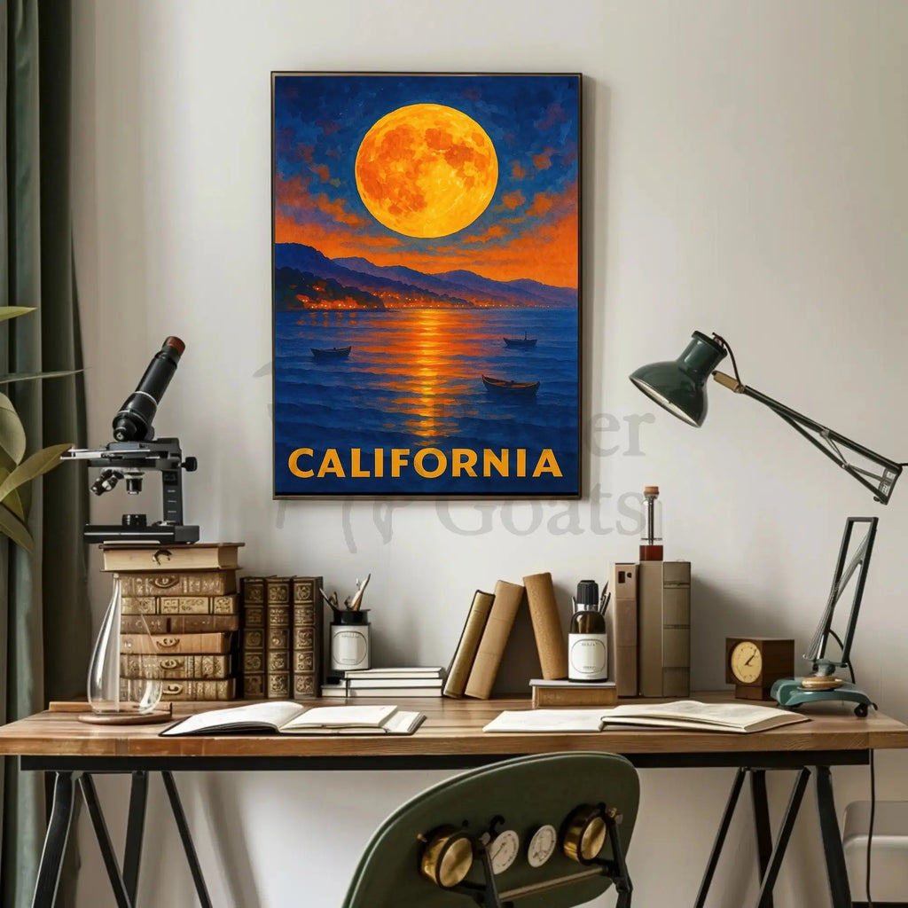 Bring the magic of a moonlit California coast into your home with the California Scenic Full Moon Retro Travel Poster from PosterGoat. This vintage-style travel print captures a glowing full moon hanging over calm, reflective waters, warm coastal lights along a rolling shoreline, and a trio of small boats drifting beneath a dramatic orange-and-blue sky — a perfect blend of retro travel nostalgia and contemporary vaporwave aesthetics.