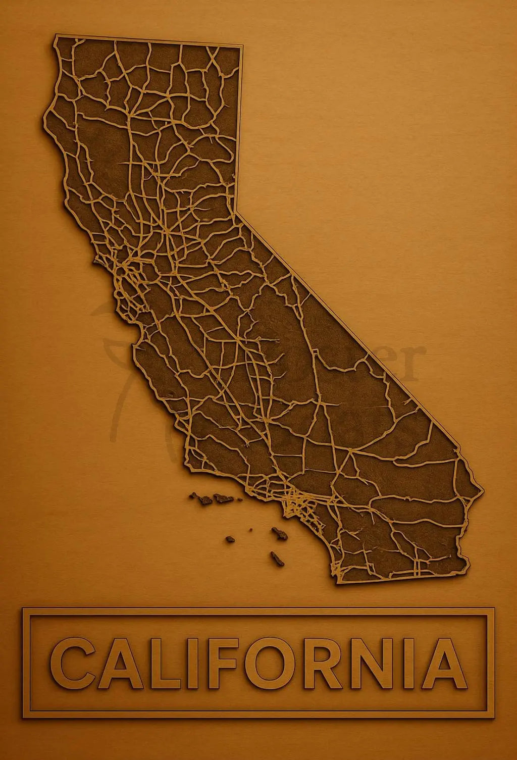 California State Map in Bronze Tones Artistic Poster from PosterGoat brings a warm, embossed focal point to any wall—melding modern minimalist design with vintage, earthy bronze tones. The poster features a detailed, raised-map silhouette of California with intricate road- and river-like patterns and a bold, recessed title block reading CALIFORNIA, creating a sculptural, gallery-quality effect that looks like metalwork on paper.