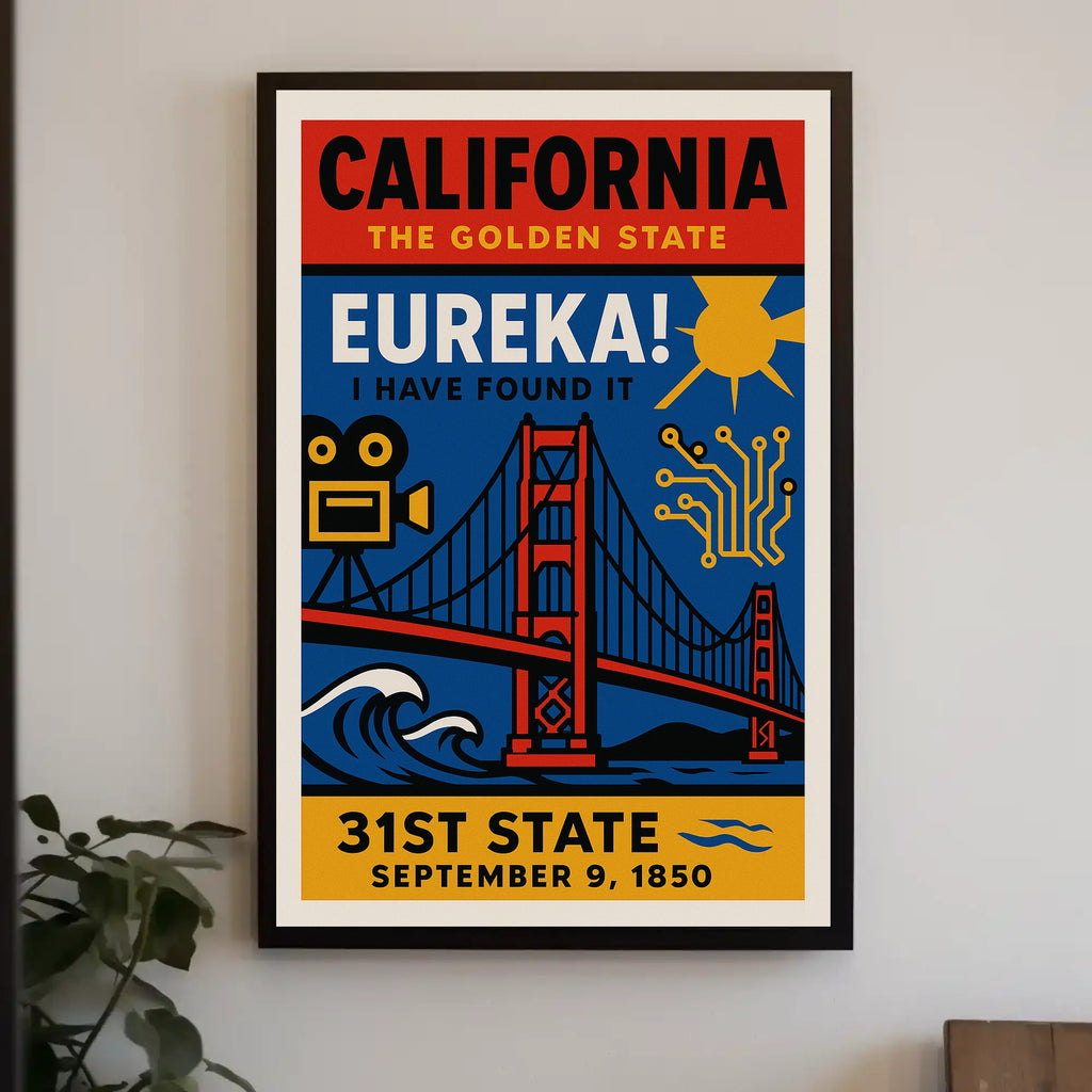 - Historic headline: Includes bold “EUREKA!” lettering and the statehood date — a tasteful tribute to California’s heritage.