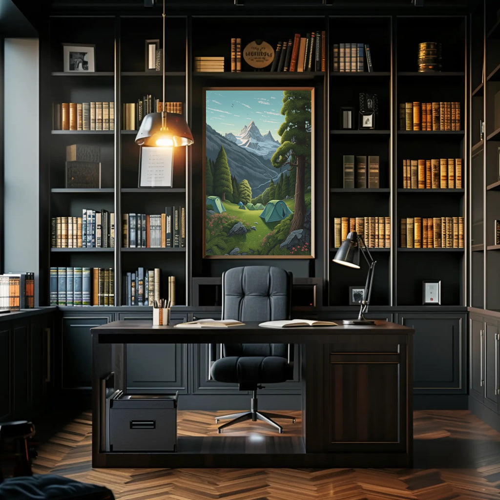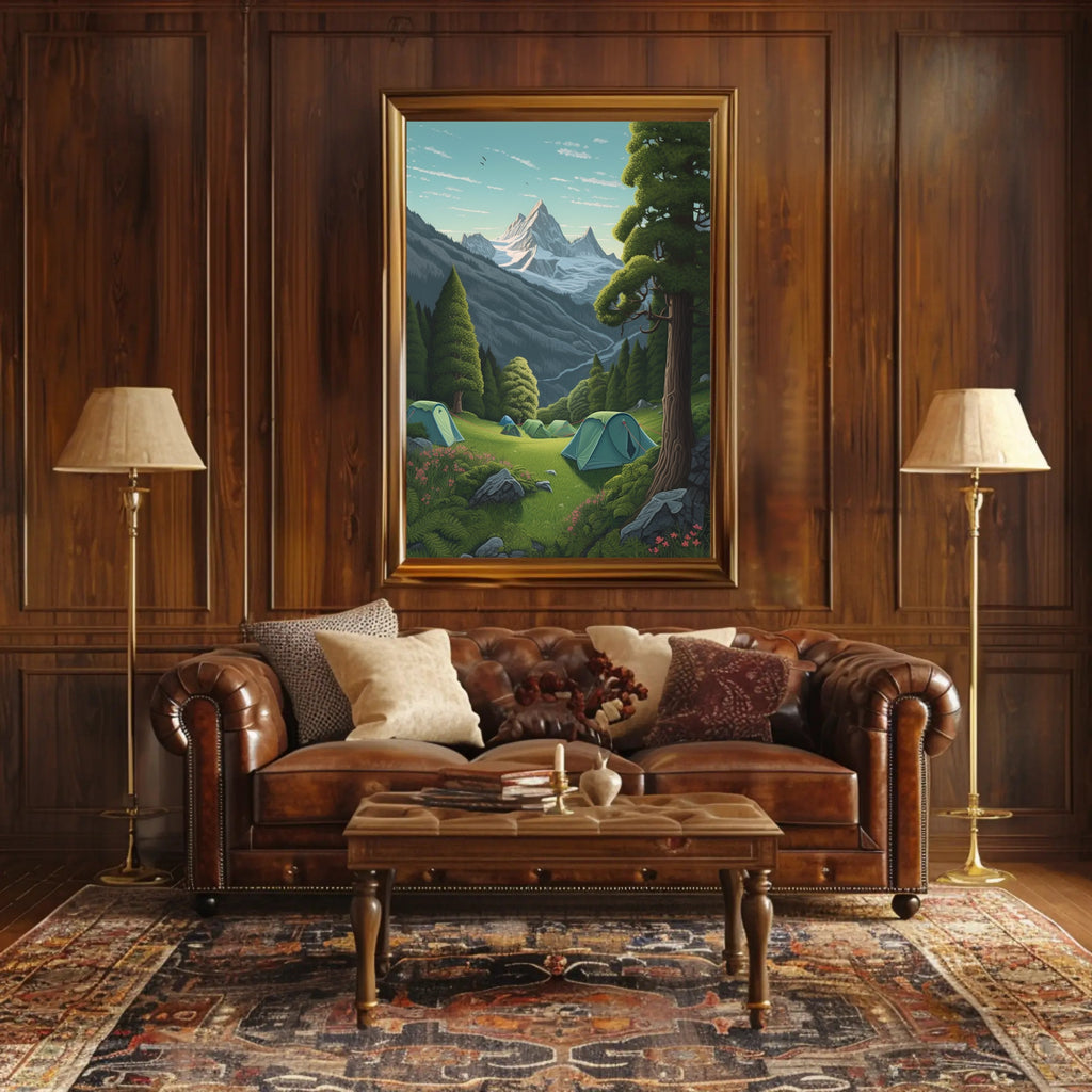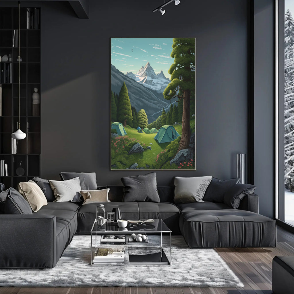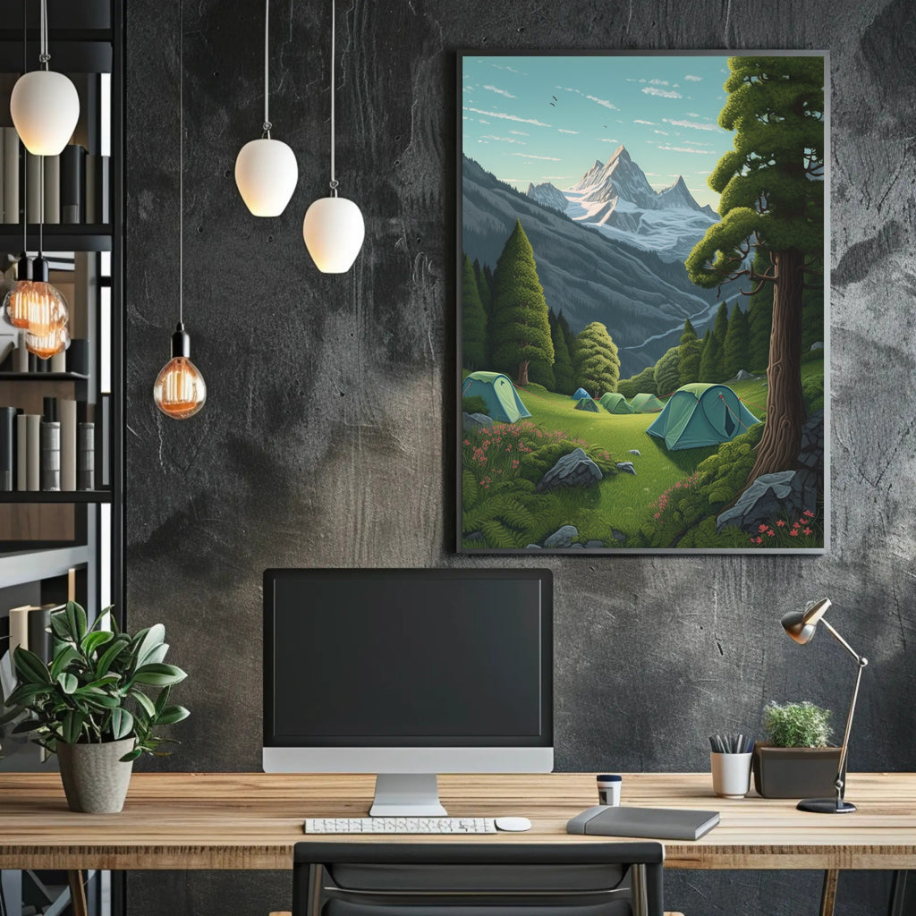 Escape to a serene alpine wilderness with this exquisite poster featuring a tranquil camping scene. Set against the breathtaking backdrop of towering, snow-capped peaks and a pristine, clear blue sky, this artwork captures the essence of outdoor adventure and peacefulness. The lush green meadow in the foreground, adorned with several inviting tents, invokes a sense of freedom and connection to nature. Perfect for adventurers at heart or those who dream of exploring the great outdoors, this poster adds a beautiful touch to any living space, bringing the soothing ambiance of the mountains into your home.