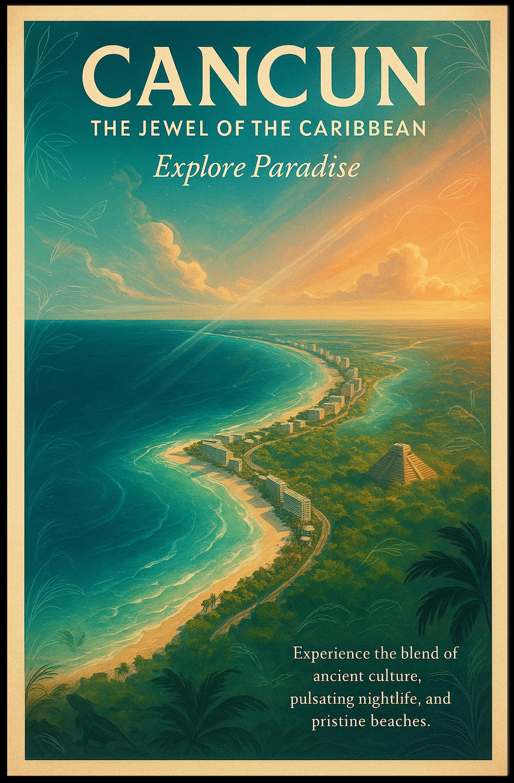 Bring a slice of turquoise shoreline and golden sunset into your home with the "Cancun — The Jewel of the Caribbean" poster from PosterGoat. This vintage-inspired travel art print captures Cancun’s sweeping crescent bay, lush jungle canopy and a sunlit horizon — a serene, scenic statement piece perfect for living rooms, offices, or vacation rental décor.