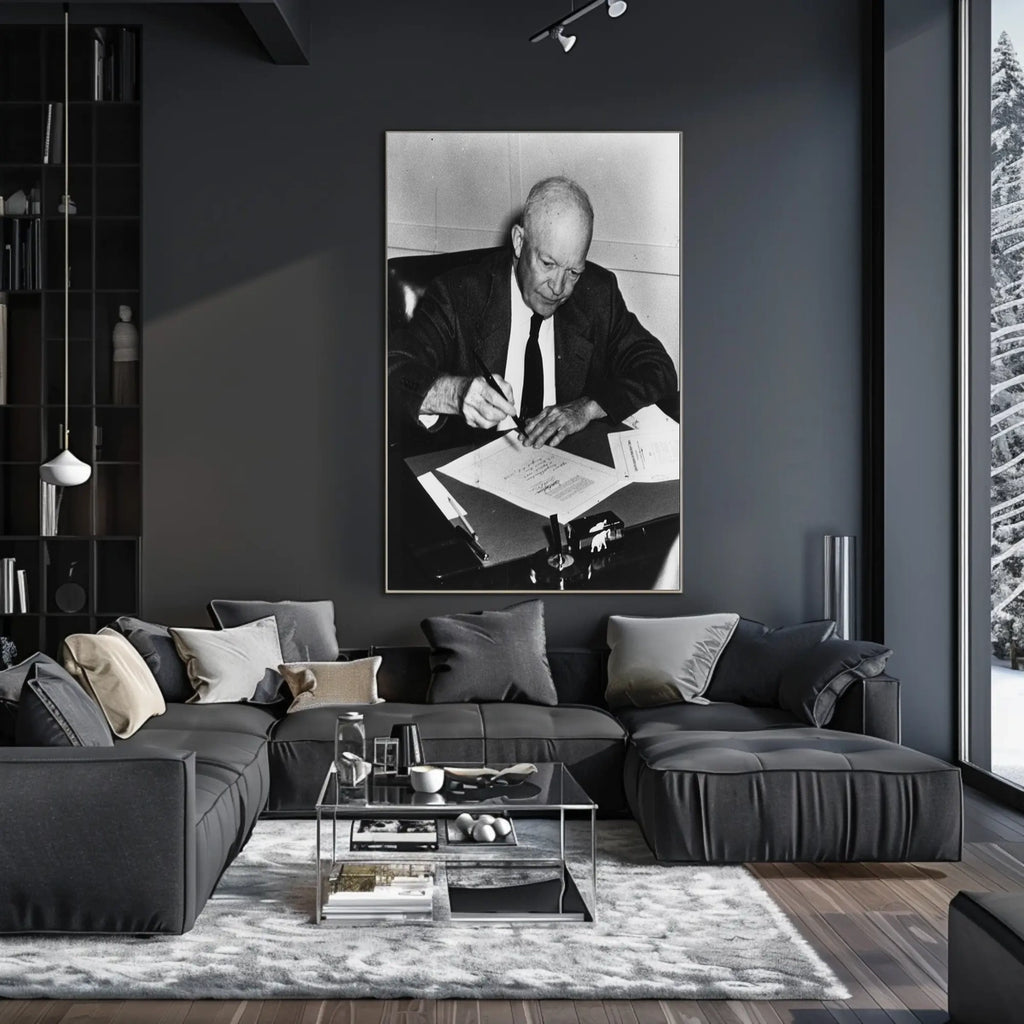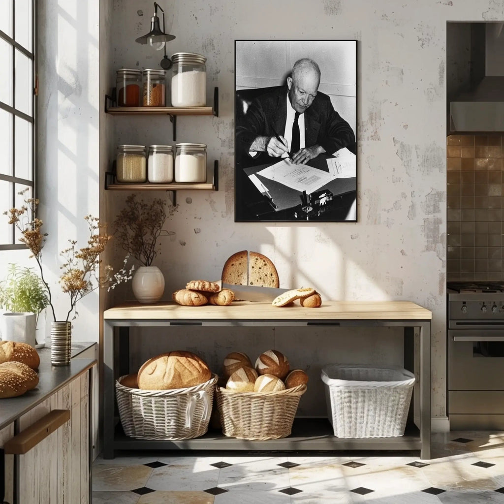 This candid image of Eisenhower writing captures his dedication and leadership. A unique addition for history enthusiasts and collectors of presidential memorabilia.