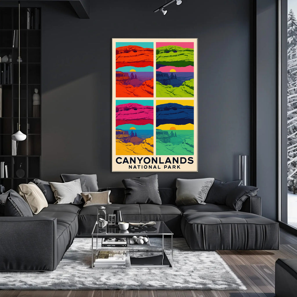 Bring the dramatic sweep of Canyonlands National Park into your home with this bold, pop-art poster from PosterGoat. Featuring a four-panel grid of the park’s iconic arch and canyon vistas rendered in vivid, contrasting colors, this landscape poster transforms a natural landmark into a modern piece of wall decor perfect for living rooms, offices, or adventure-inspired spaces.