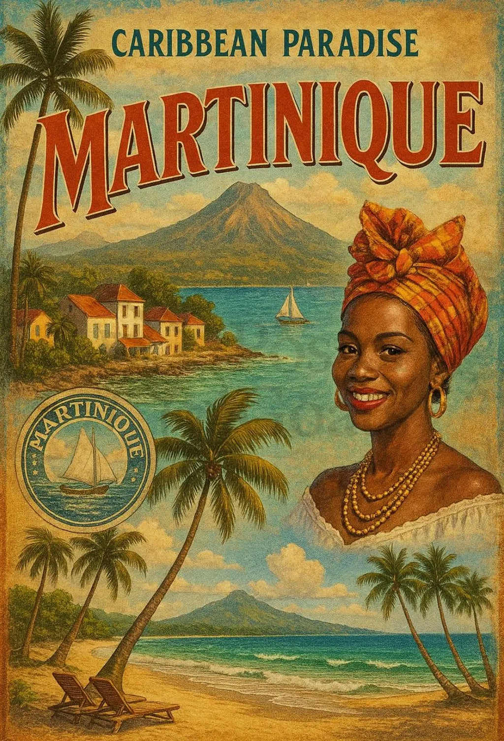 Transport your space to sun-warmed shores with the Caribbean Paradise Martinique Vintage Travel Poster by PosterGoat — a richly detailed mid-century style print that captures palm-fringed beaches, a distant volcanic peak, a graceful sailboat and the warm smile of island heritage.
