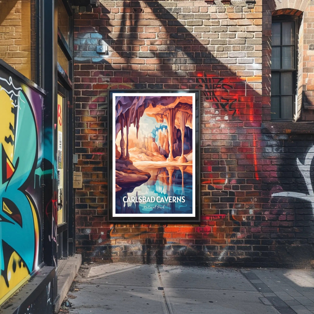 Bring the magic of Carlsbad Caverns into your space with this vintage-inspired travel poster from PosterGoat. Warm, painterly hues and a minimalist, retro composition capture towering stalactites and stalagmites reflected in a mirror-like pool, creating a mesmerizing focal point for any room.