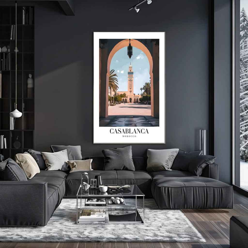 Step through a sunlit arch and into the heart of Morocco with the Casablanca Mosque View: Timeless Travel Poster by PosterGoat. This evocative artwork frames a majestic mosque tower through a classic archway, palm trees swaying at the sides and a serene Moroccan sky above — a perfect blend of Islamic architecture art and vintage travel decor that brings cultural heritage into any living space.