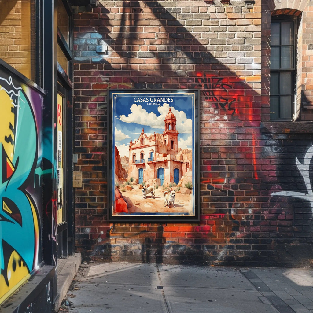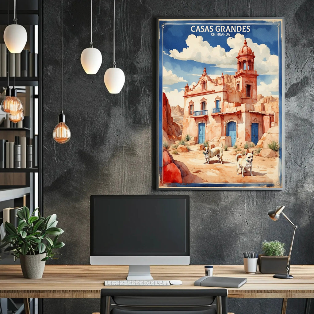 Capture the historic charm of northern Mexico with the Casas Grandes Chihuahua Cultural Heritage Poster from PosterGoat. This illustrated travel-style print brings a sunbaked hacienda, graceful bell tower and dramatic rocky desert formations to life in warm, watercolor-inspired tones. Two friendly Chihuahuas in the foreground add local character and playful detail, making this piece both evocative and inviting for any wall.