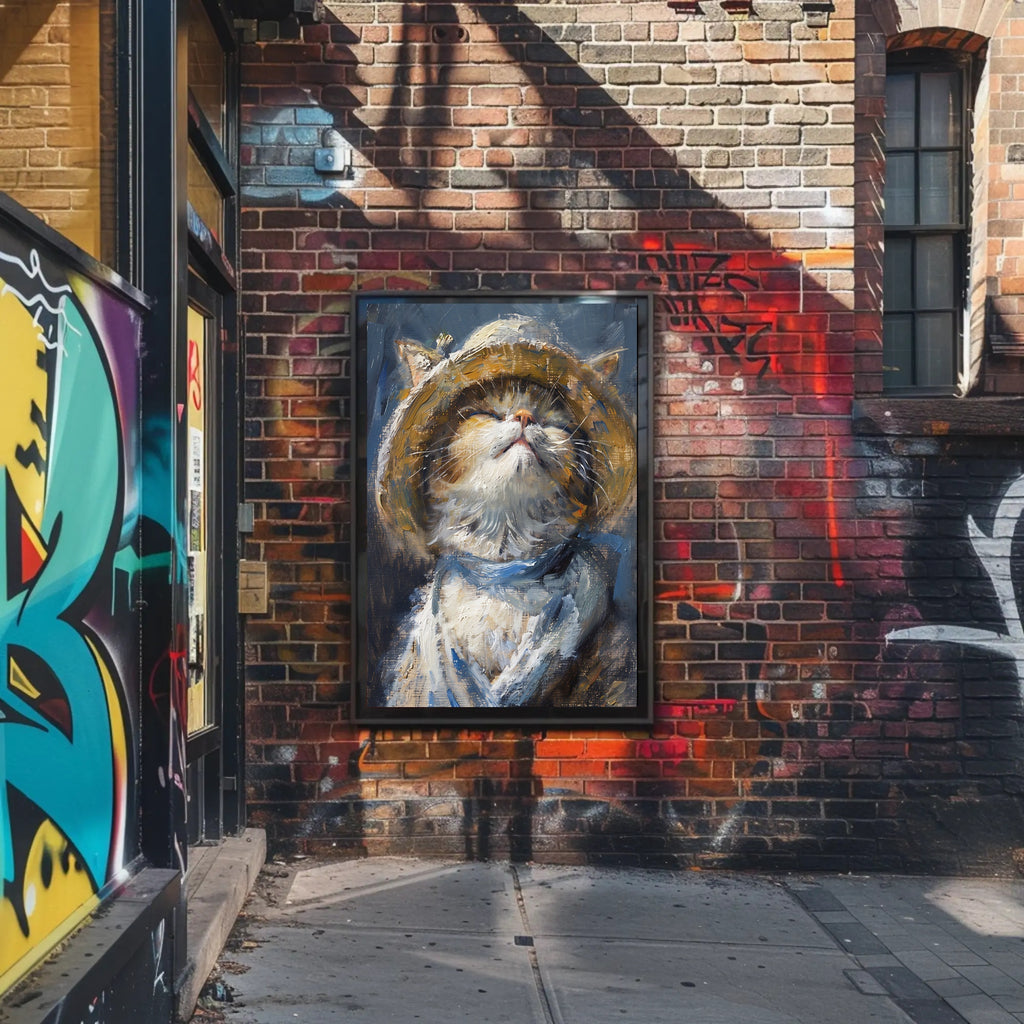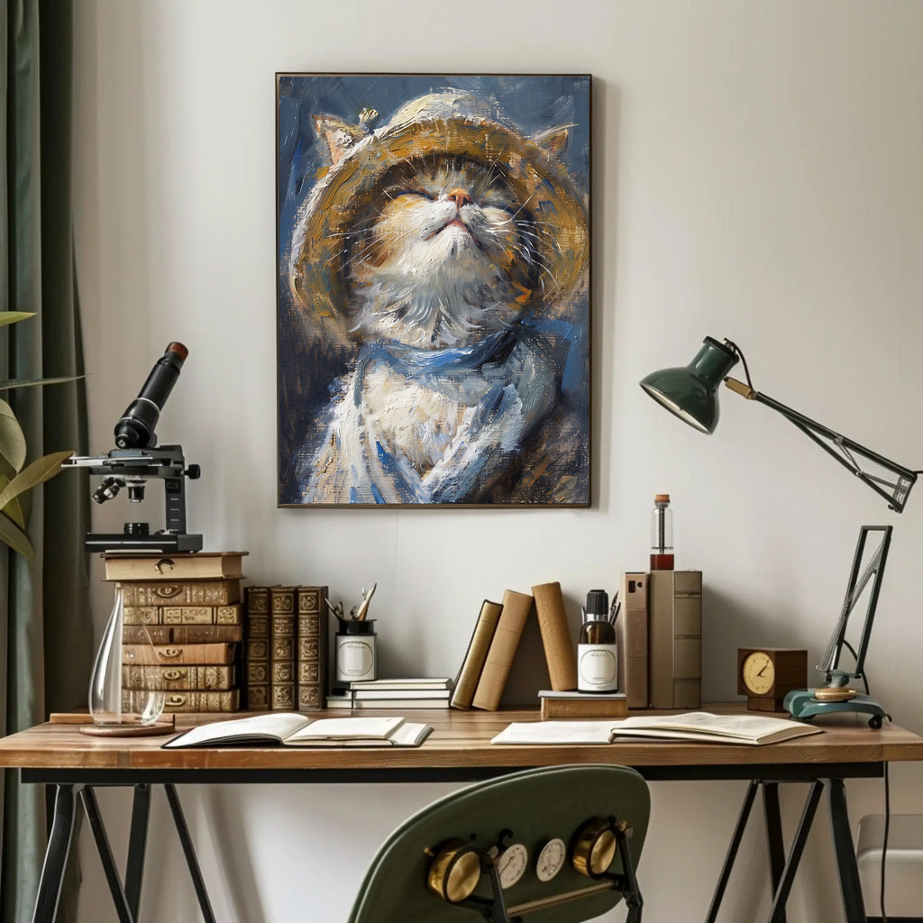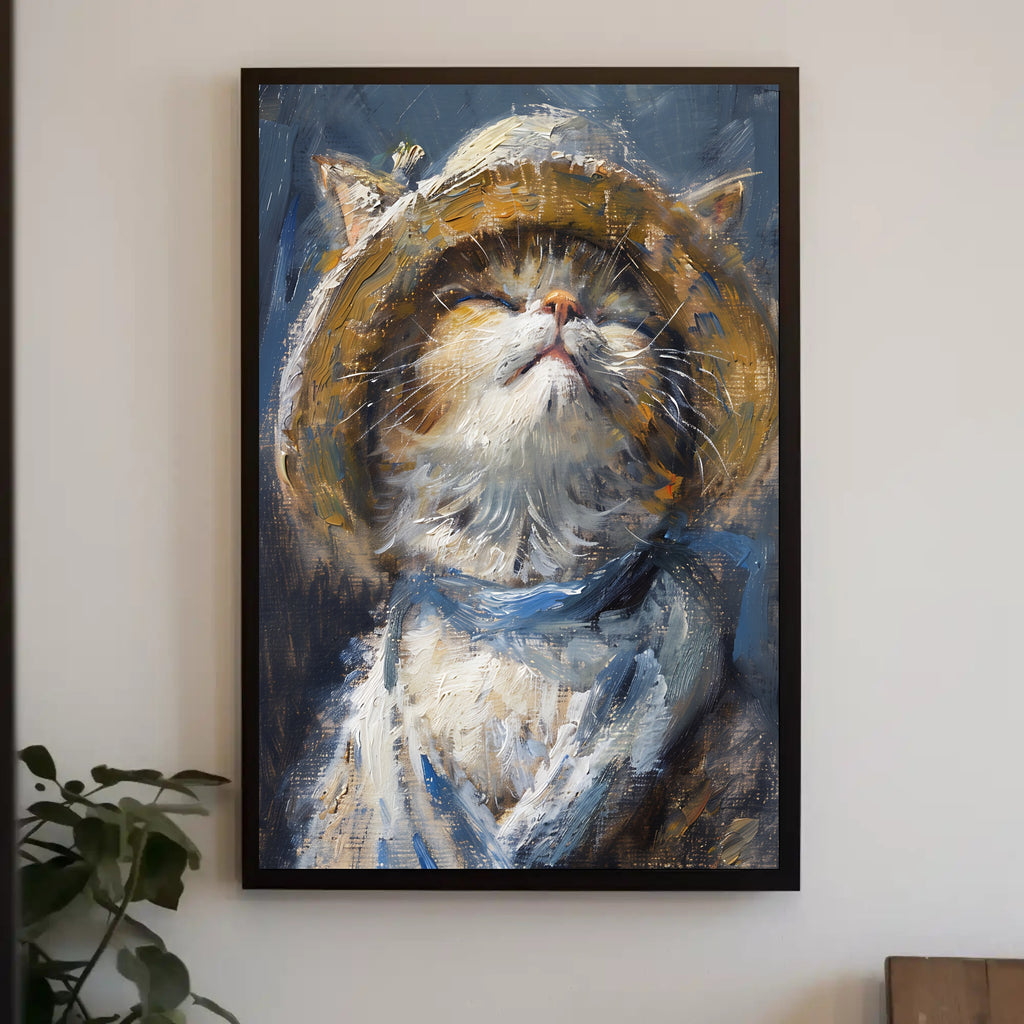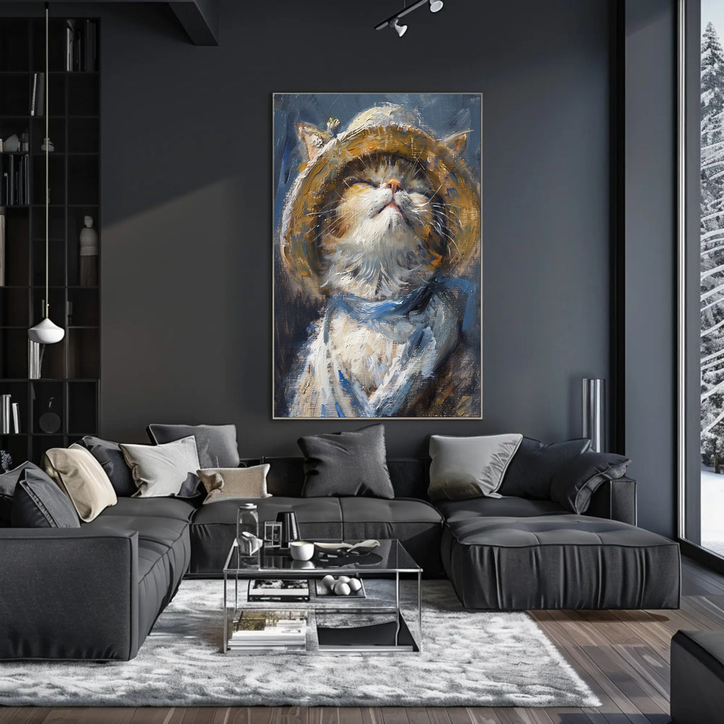 - Striking focal point: A joyful cat wearing a straw hat and light blue scarf makes a cheerful statement — perfect for living rooms, bedrooms, nurseries, or home office walls.