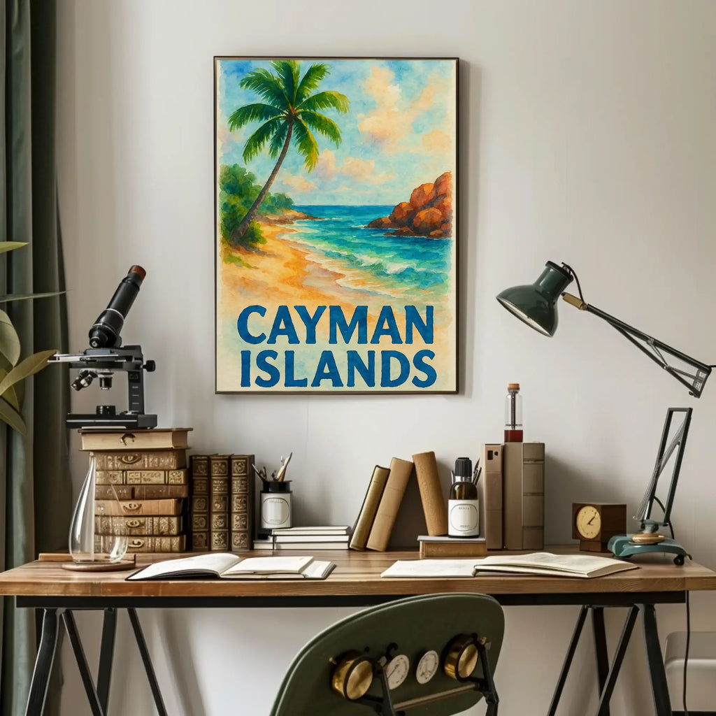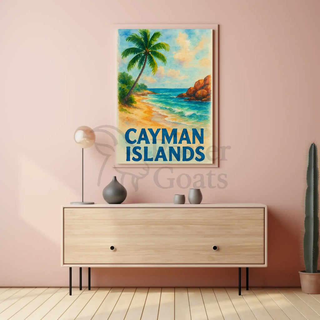 Bring a slice of island paradise into your home with the Cayman Islands Tropical Beach Scene Travel Poster from PosterGoat. This watercolor-style poster captures the gentle curve of a palm-fringed shoreline, crystalline turquoise waves, warm sandy hues and dramatic rocky outcrops — all rendered in vibrant, soothing colors that evoke vacation memories and seaside relaxation.