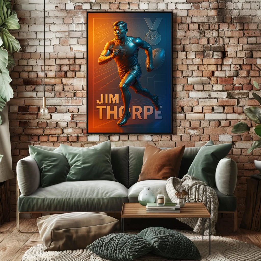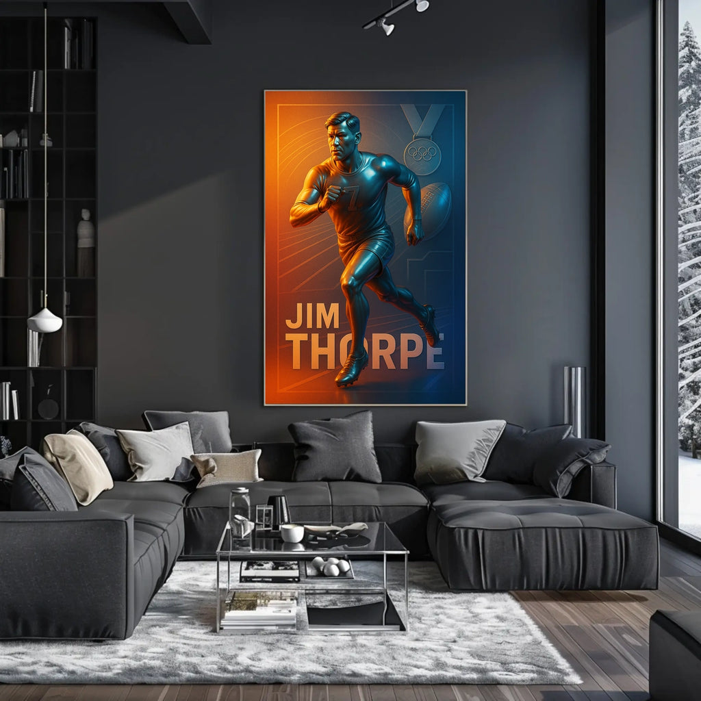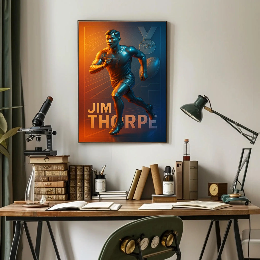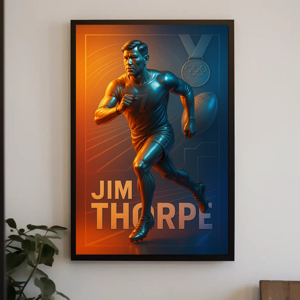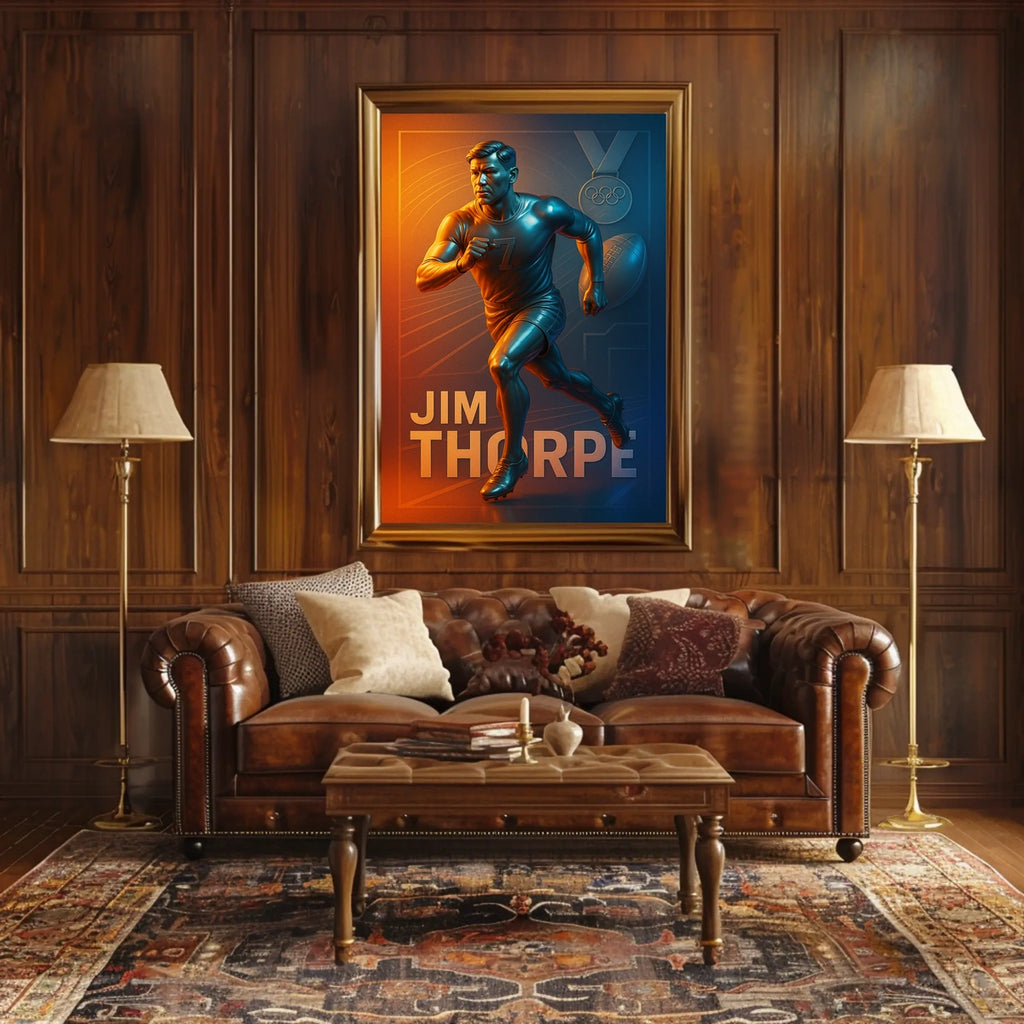 Immerse your space in the energy of elite athletics with this Celebrating Athletic Excellence Poster. This vibrant artwork captures an iconic athlete pushing limits in track and field and football, using bold blue and orange hues to symbolize determination, strength, and victory. A striking centerpiece for any sports room.