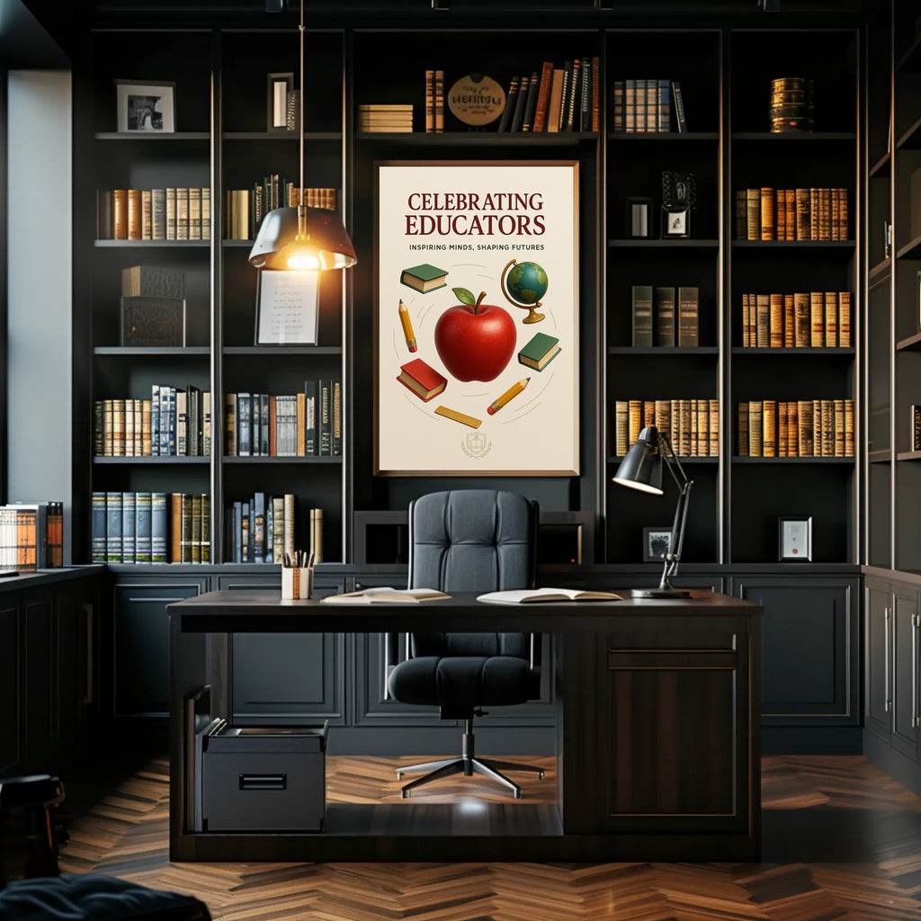 Celebrate the educators who shape tomorrow with this striking "Celebrating Educators" poster from PosterGoat. Designed in a warm, minimalist illustrative style, the artwork centers on a bold red apple surrounded by classic school icons — globe, pencils, stacked books and a ruler — creating an uplifting focal point for any classroom, office, or hallway.